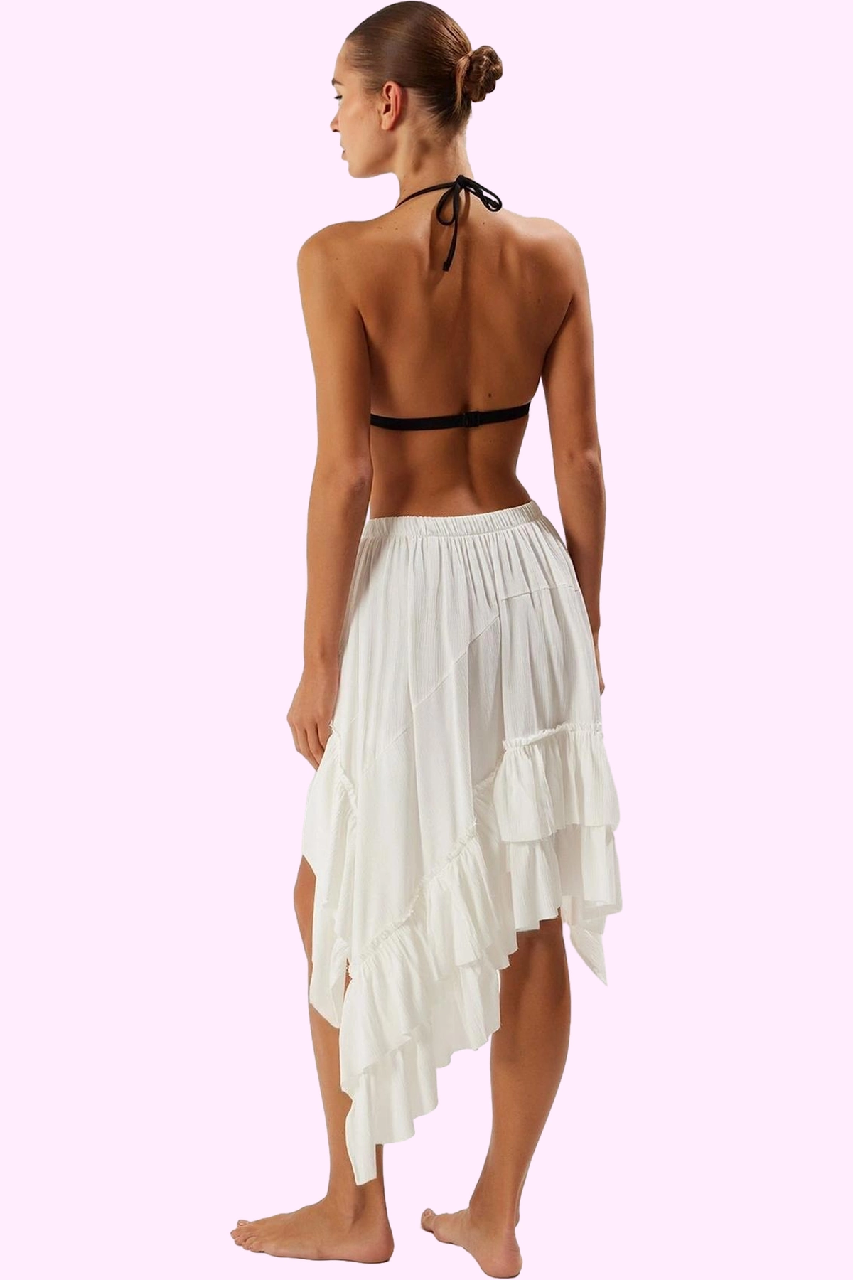 Yazın enerjisini yansıtan, şık ve rahat bir plaj eteğiyle tanışmaya hazır olun! Ekru renginin doğal güzelliği ve asimetrik kesimiyle dikkat çeken bu etek, benzersiz bir stil sunuyor. Crinkle dokuma kumaşı, hafif ve nefes alabilir yapısıyla gün boyu konforlu bir kullanım sağlarken, fırfırlı detayıyla feminen bir görünüm katıyor. Cut out detaylarıyla öne çıkan bu plaj eteği, plaj şıklığınızı tamamlayacak.