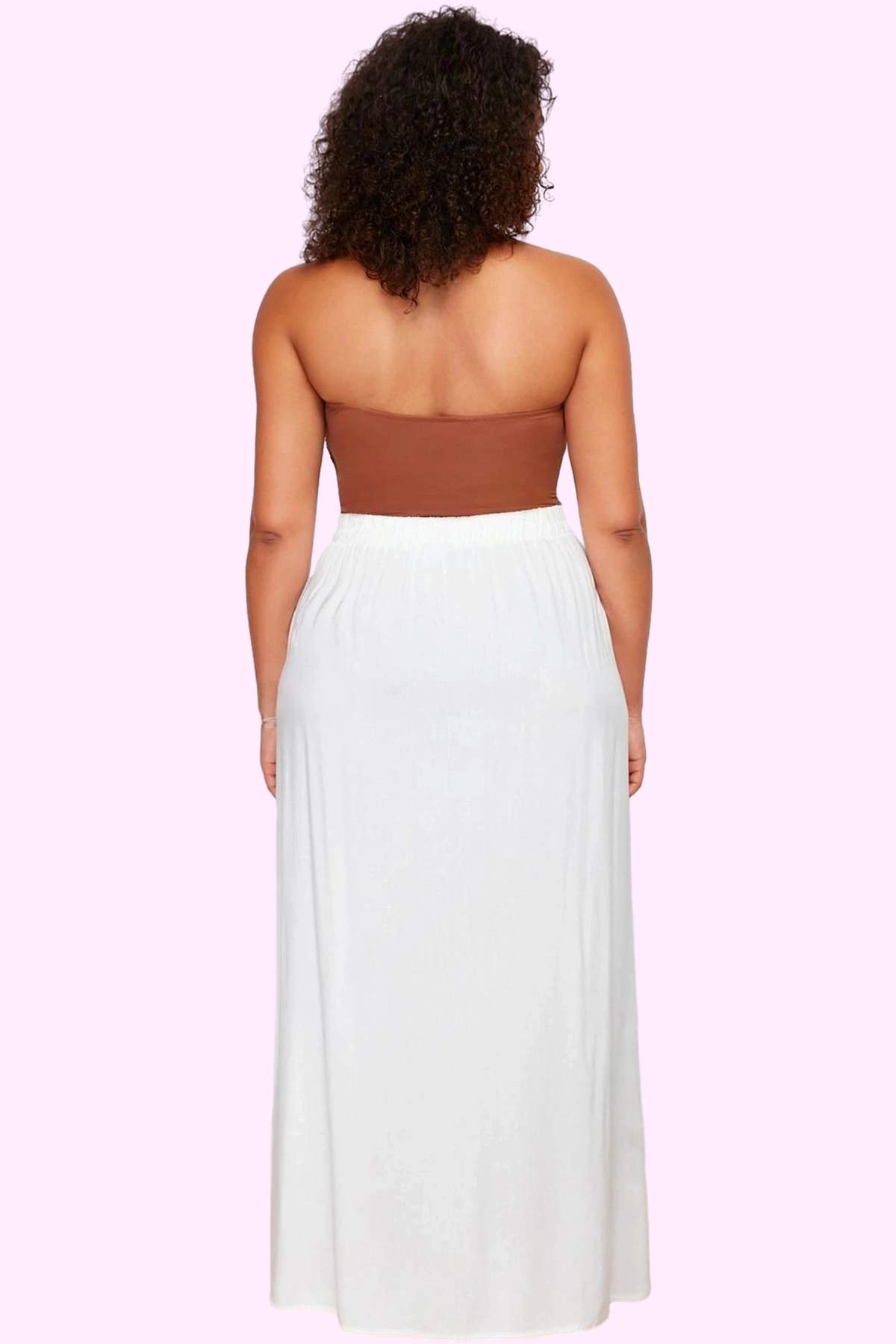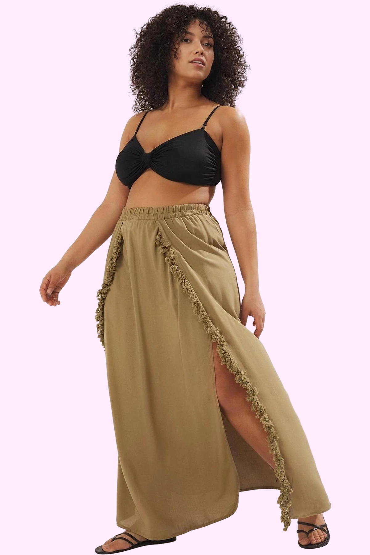 Yumuşak dokusuyla teninizde harika hissettirecek olan bu maxi etek, sıcak yaz günlerinde serin ve rahat kalmanızı sağlayacak. Şallı dokuma yapısı, eteğe hafif ve dökümlü bir görünüm verirken, yanlardaki yırtmaçlar hareket özgürlüğü sunuyor. Püsküller ise eteğe hareketli ve canlı bir dokunuş katıyor. Ekru renginin zamansız şıklığı, gardırobunuzdaki diğer parçalarla kolayca kombinlenebilecek çok yönlülük sunuyor.
