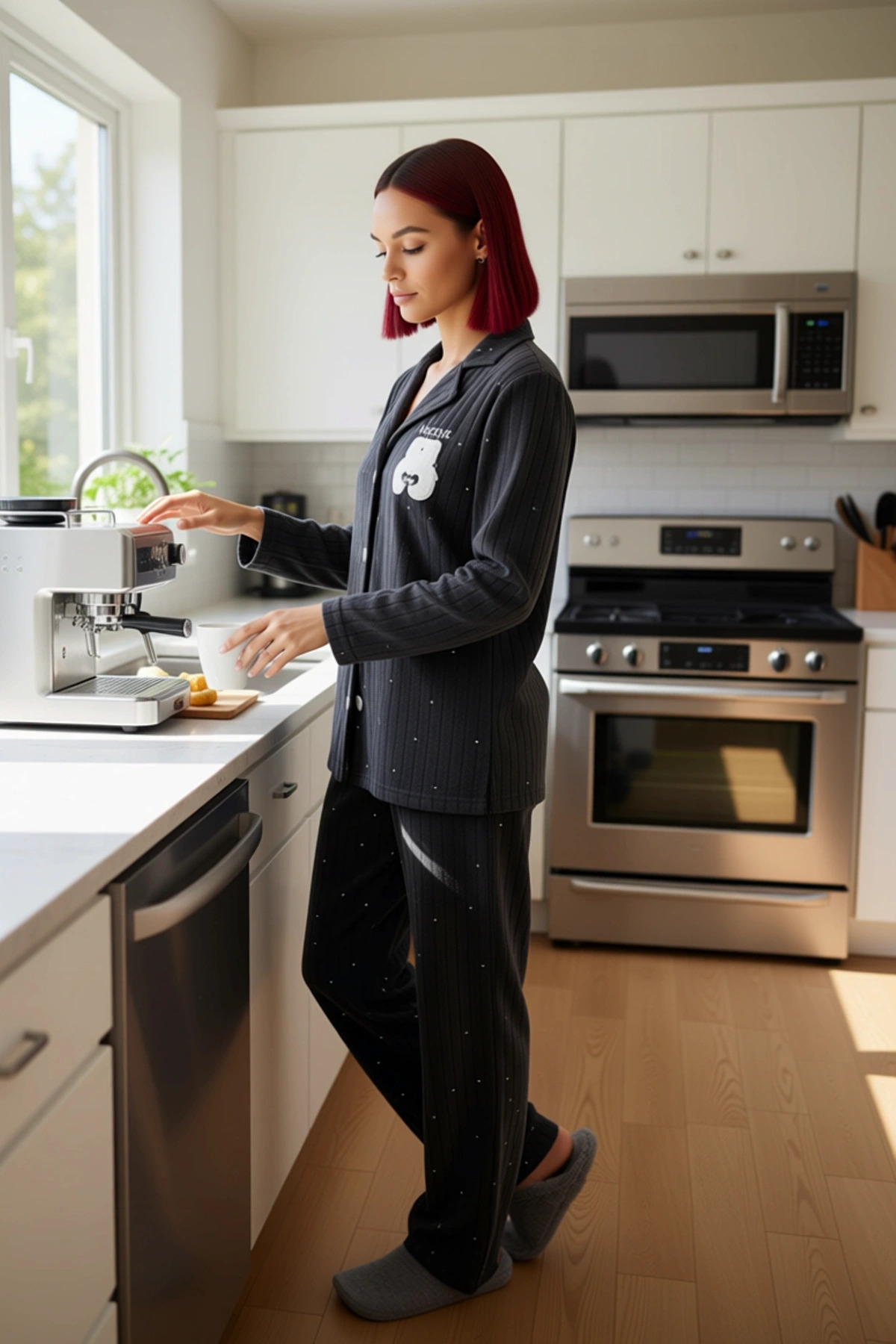Kadınlara özel olarak tasarlanan bu polar pijama takımı, kış aylarında sıcaklık ve konforu bir arada sunuyor. Ürün, %100 polyester materyalden üretilmiştir, bu da ona yumuşak bir dokunuş ve üstün bir ısı yalıtımı özelliği kazandırır. Antrasit rengi zemin üzerine serpiştirilmiş beyaz puantiyeler, klasik bir zarafet katarken, gömlek üzerinde yer alan sevimli hayvan baskısı ise tasarıma neşeli bir dokunuş ekler. Bu pijama takımı, evde geçirdiğiniz zamanları daha keyifli ve rahat hale getirmek için özenle düşünülmüş bir tasarıma sahiptir. Hem şık görünmek hem de maksimum konforu yaşamak isteyen kadınlar için ideal bir seçimdir. Bu pijama takımı, rahat bir yaşam tarzını benimseyenler için özel olarak tasarlanmıştır. Gömlek yaka ve uzun kollu üst, klasik bir pijama görünümü sunarken, regular kesim sayesinde hareket özgürlüğü sağlar. Pantolonun normal bel ve boru paça detayı, gün boyu rahatlık sunar. Polar kumaşın yumuşaklığı, cildinize nazikçe dokunarak ekstra bir konfor hissi yaratır. Bu takım, evdeki rahat anlarınızda size eşlik edecek, hem gözünüze hem de bedeninize hitap edecek bir parçadır. Günlük kullanım için son derece uygundur ve sizi sıcacık tutacaktır. Kış mevsiminin vazgeçilmez parçalarından biri olan bu pijama takımı, soğuk havalarda sizi ısıtacak. Bu takımı, rahat bir ev terliği, yumuşak bir şal veya peluş bir hırka ile tamamlayabilirsiniz. Pantolonun boru paça kesimi, farklı ev ayakkabılarıyla uyum sağlar. Bu ürün, kolay temizlenebilir yapısıyla da dikkat çeker. Makinede yıkanabilir olması, günlük kullanımda pratiklik sunar.