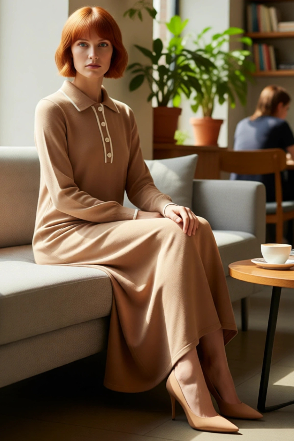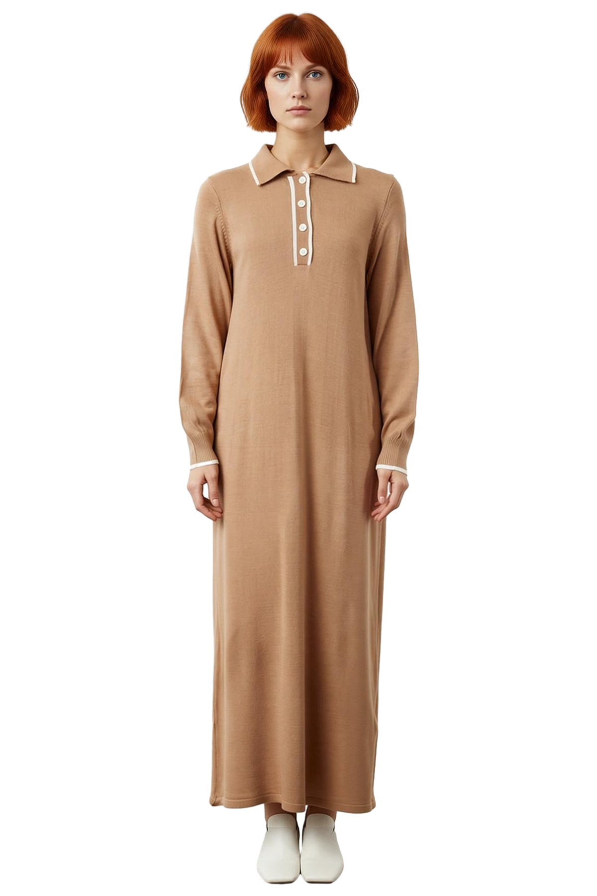 Kadın Polo Yaka Biyeli Maxi Triko Elbise Düşük Kol Rahat Kesim Kış Sezonu İçin İdeal Model