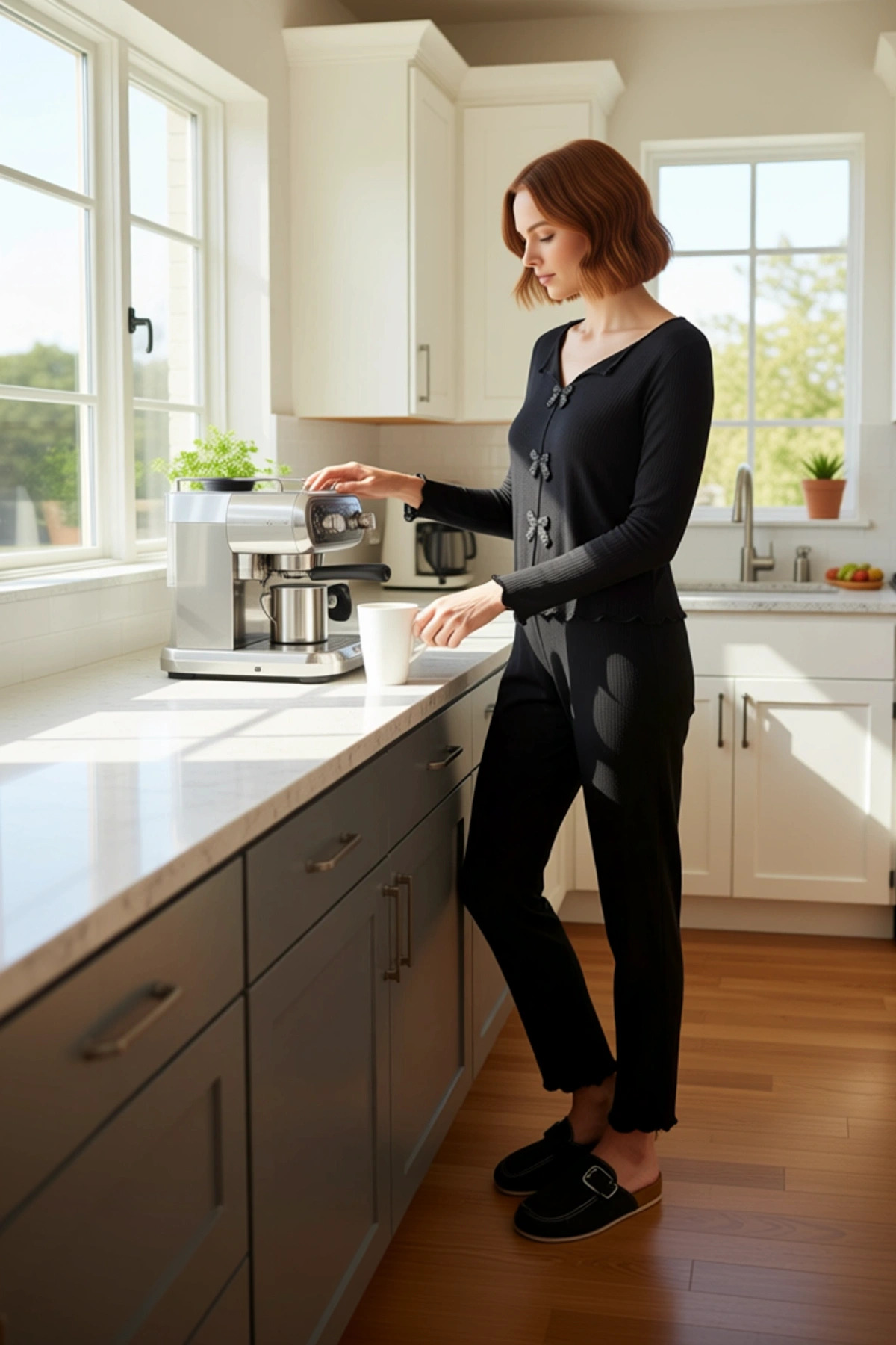 Kadınlar için özel olarak tasarlanmış bu siyah puantiyeli ev giyim takımı, konforu ve şıklığı bir araya getiriyor. Üst kısmında zarif bir V yaka ve uzun kollu bir tasarım bulunuyor. Takımın en dikkat çekici özelliklerinden biri, ön kısmında yer alan şık kurdele detayları. Bu detaylar, takıma hoş bir estetik katıyor. %96 oranında viskoz ve %4 oranında elastan içeren örme kumaşı, cildinize nazikçe dokunarak gün boyu üst düzey bir rahatlık sağlıyor. Regular kalıbı, vücudunuzu nazikçe sararak hareketlerinizi kısıtlamadan rahat bir kullanım sunuyor. Bu takım, evde geçirdiğiniz zamanı daha keyifli hale getirmek için özenle üretildi. Bu ev giyim takımı, V yaka ve uzun kollu üstüyle hem sıcaklık hem de şıklık sunuyor. Pantolonun boru paça kesimi, rahat bir kullanım sağlarken, normal beli gün boyu konfor vadediyor. Kaşkorse dokuma kumaşın esnek yapısı, hareket özgürlüğünüzü artırıyor. Kurdele detayları, takıma zarif bir dokunuş eklerken, puantiyeli desen ise klasik ve zamansız bir görünüm sağlıyor. Bu takım, evde dinlenirken, hafif egzersiz yaparken veya ev işleriyle uğraşırken tercih edilebilir. Cool ve konforlu bir persona yansıtan bu takım, lounge ve ev ortamları için ideal. Kış mevsiminde sıcak ve rahat kalmak isteyen kadınlar için mükemmel bir seçim olan bu pijama takımı, şık siyah rengi ve puantiyeli deseniyle dikkat çekiyor. Bu takımı, rahat bir ev terliği ve yumuşak bir hırka ile kombinleyerek evdeki stilinizi tamamlayabilirsiniz. Ayrıca, bu takımı evde keyifli bir okuma seansı veya dinlendirici bir banyo sonrası giyebilirsiniz. Kolay bakımı sayesinde uzun yıllar boyunca ilk günkü gibi kalmasını sağlayabilirsiniz. Makinede yıkanabilir olması, günlük kullanım için büyük bir kolaylık sağlıyor.