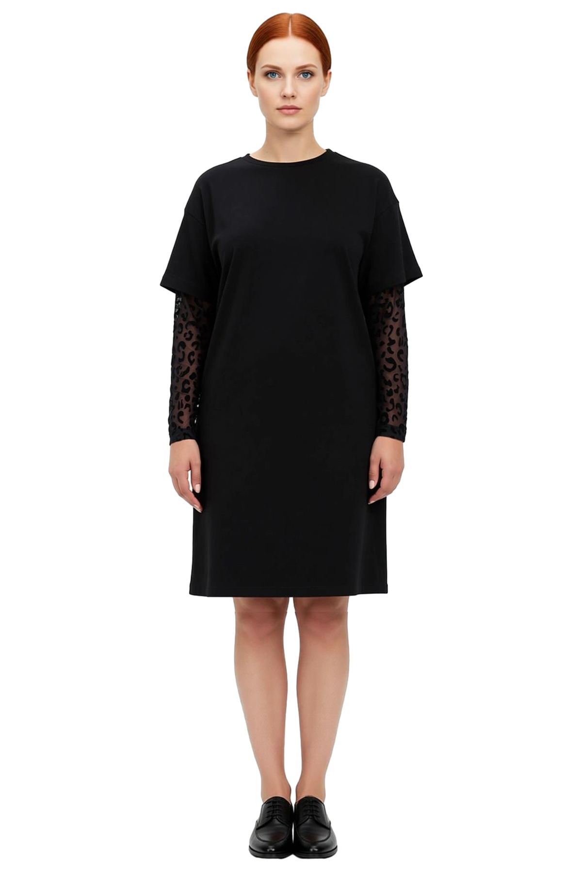 Ürün Özellikleri: T-Shirt elbise kalıp, %100 pamuk materyal, düz ana beden tül leopar desenli kol, bisiklet yaka, düşük kol uzun kol, süprem örme kumaş, siyah renk.