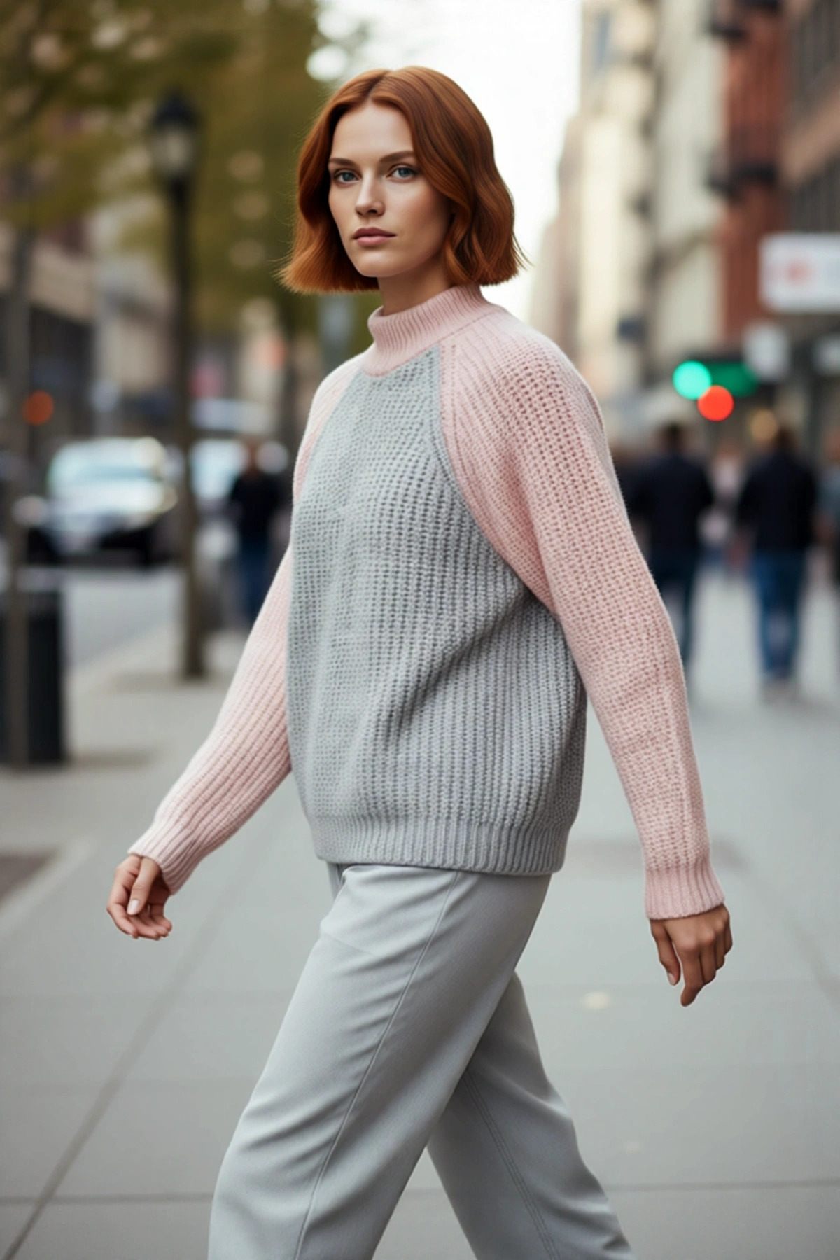Ürün Özellikleri: Oversize kalıp, akrilik polyester materyal, renk bloklu desen, dik yaka, reglan kol, triko kumaş, pembe gri renk, baskısız tasarım.
