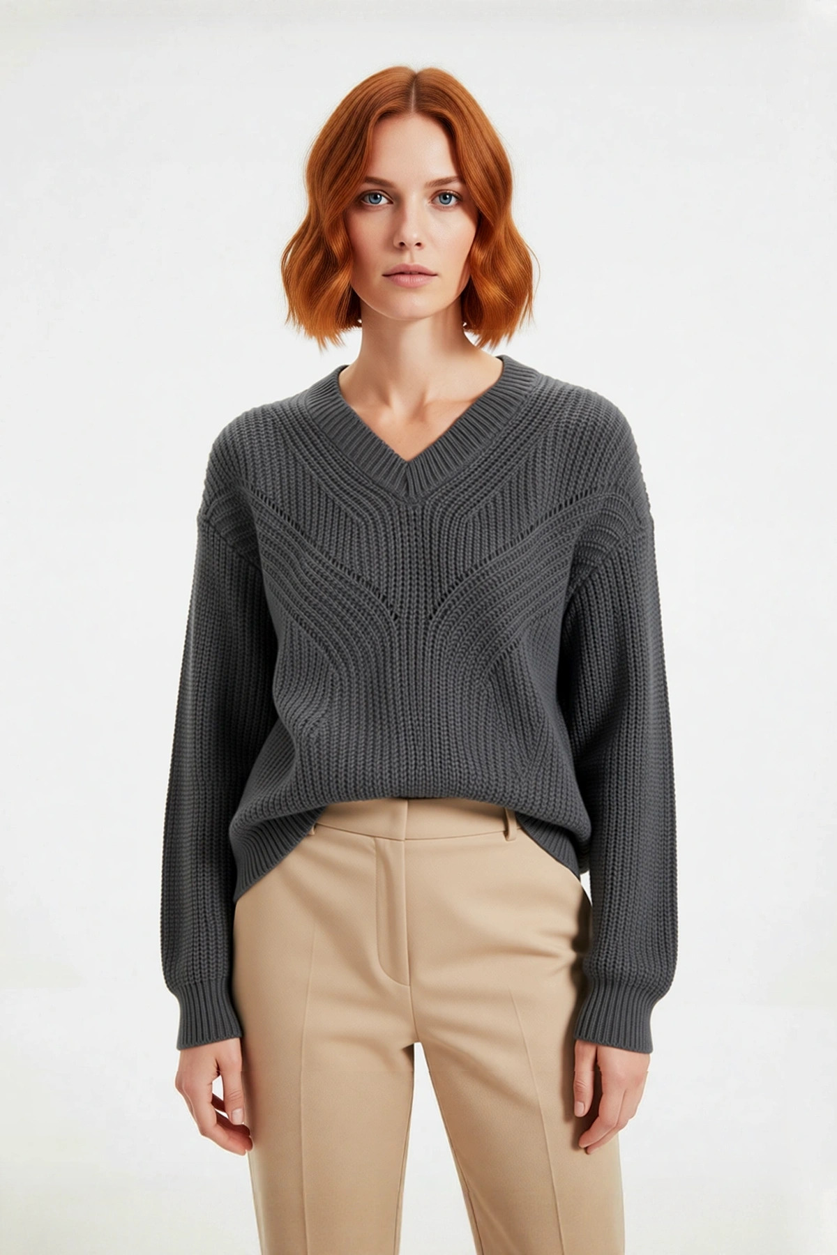 Bu zarif Kadın Akrilik Triko Kazak, regular kalıbı ile rahatlığı ve şıklığı bir araya getiriyor. Ajurlu deseni ve modern V yaka kesimi, sıradanlıktan uzak, özgün bir stil sunar. %100 akrilik materyali sayesinde kış aylarında üstün sıcaklık ve yumuşak bir his sağlarken, gri rengi her türlü alt giyimle kolayca uyum sağlayarak çok yönlü kullanım imkanı sunar. Casual/günlük ortamlar için tasarlanmış bu kazak, Cool & Comfort personasına hitap ederek gün boyu kendinizi iyi hissetmenizi sağlar.