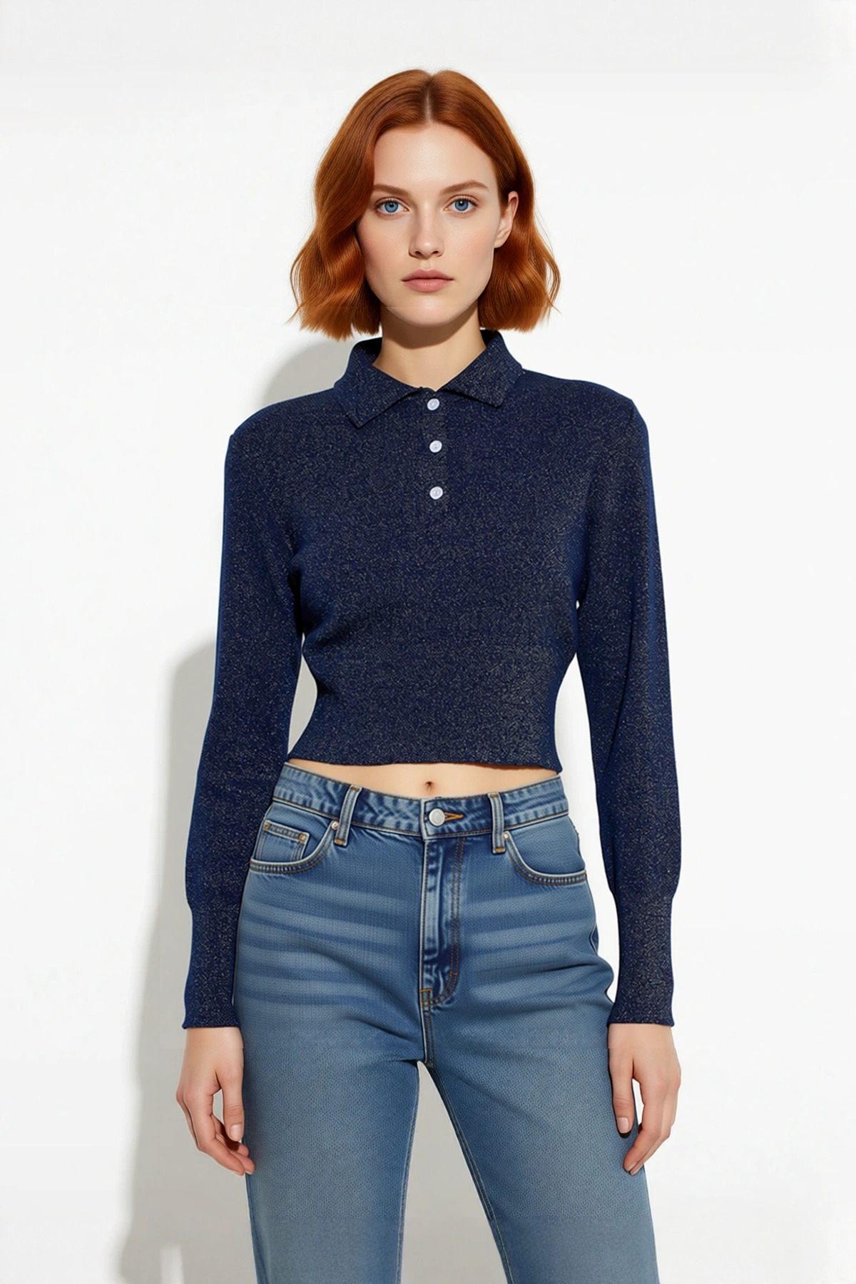Ürün Özellikleri: Regular kalıp, triko kumaş, düz desen, polo yaka, standart kol, lacivert renk, orta kalınlık, super crop boy, tek plaka dokuma.