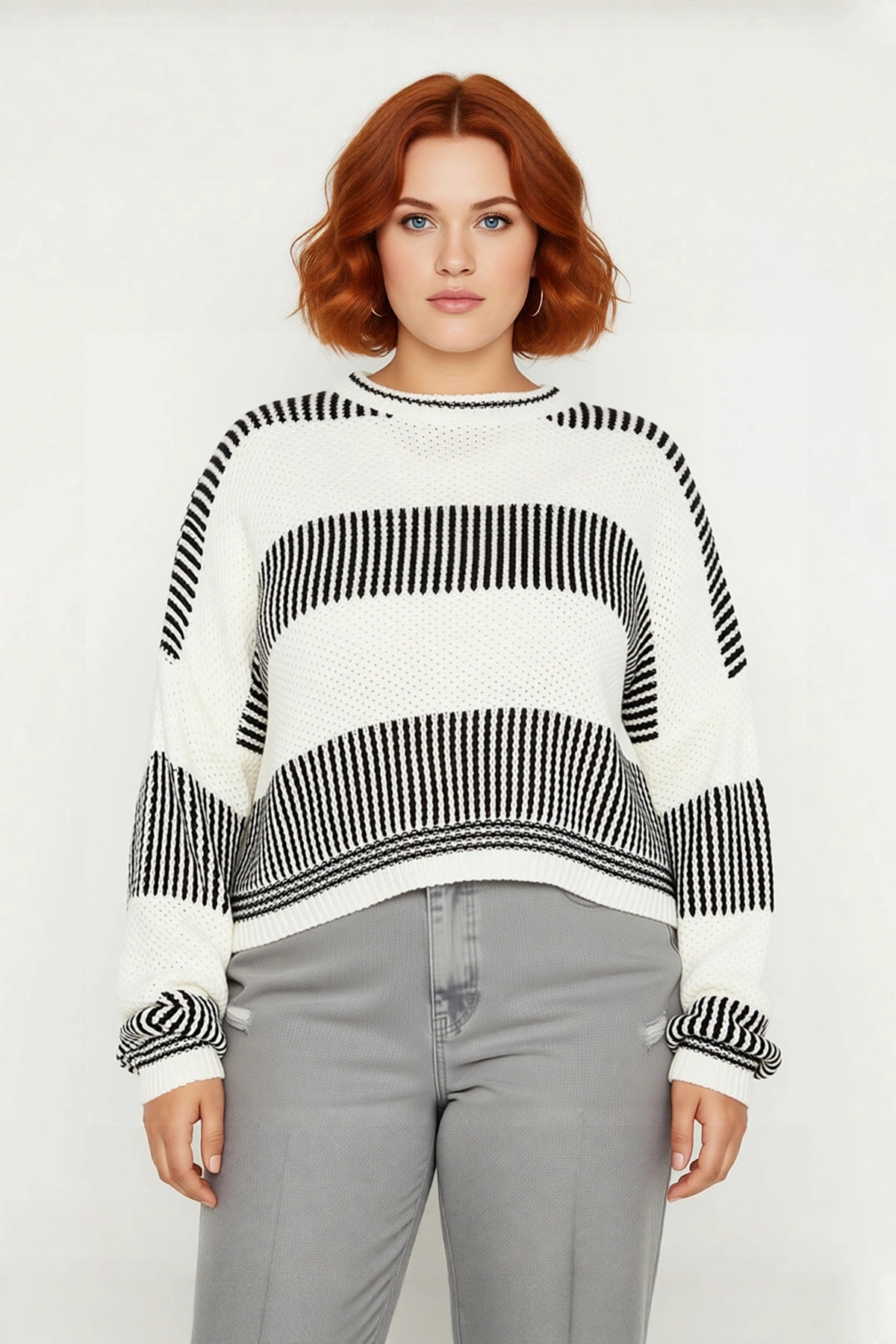 Ürün Özellikleri: Relaxed kalıp, akrilik materyal, çizgili desen, bisiklet yaka, düşük kol, triko kumaş, ekru renk.