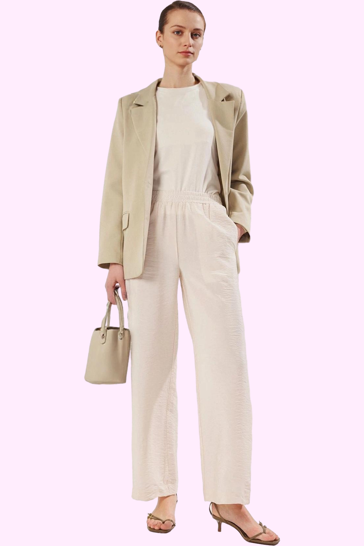 Günlük yaşamınız için mükemmel bir tercih olan bu kadın pantolonu, rahatlığı ve şıklığı bir arada sunuyor. Bej rengi ve geniş paça tasarımıyla modern ve zarif bir görünüm yakalayabilirsiniz. Normal bel yüksekliği, vücut hatlarınızı dengeli bir şekilde gösterirken, dokuması sayesinde gün boyu konforlu bir kullanım deneyimi yaşarsınız. Nefes alan kumaşı ile yaz aylarında bile serin kalmanıza yardımcı olur. Makinede yıkama kolaylığı ile bakımı oldukça pratiktir. Türkiye’de üretilmiş, yüksek kaliteli malzemelerden üretilmiştir.