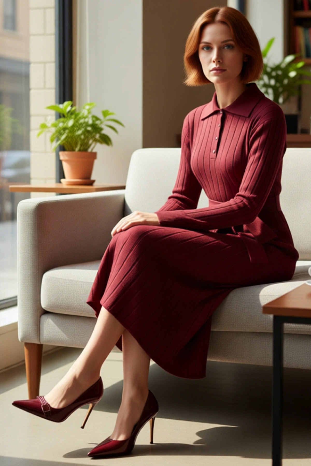 Ürün Özellikleri: Shift kalıp, akrilik materyal, düz desen, polo yaka, standart kol, triko kumaş, bordo renk.