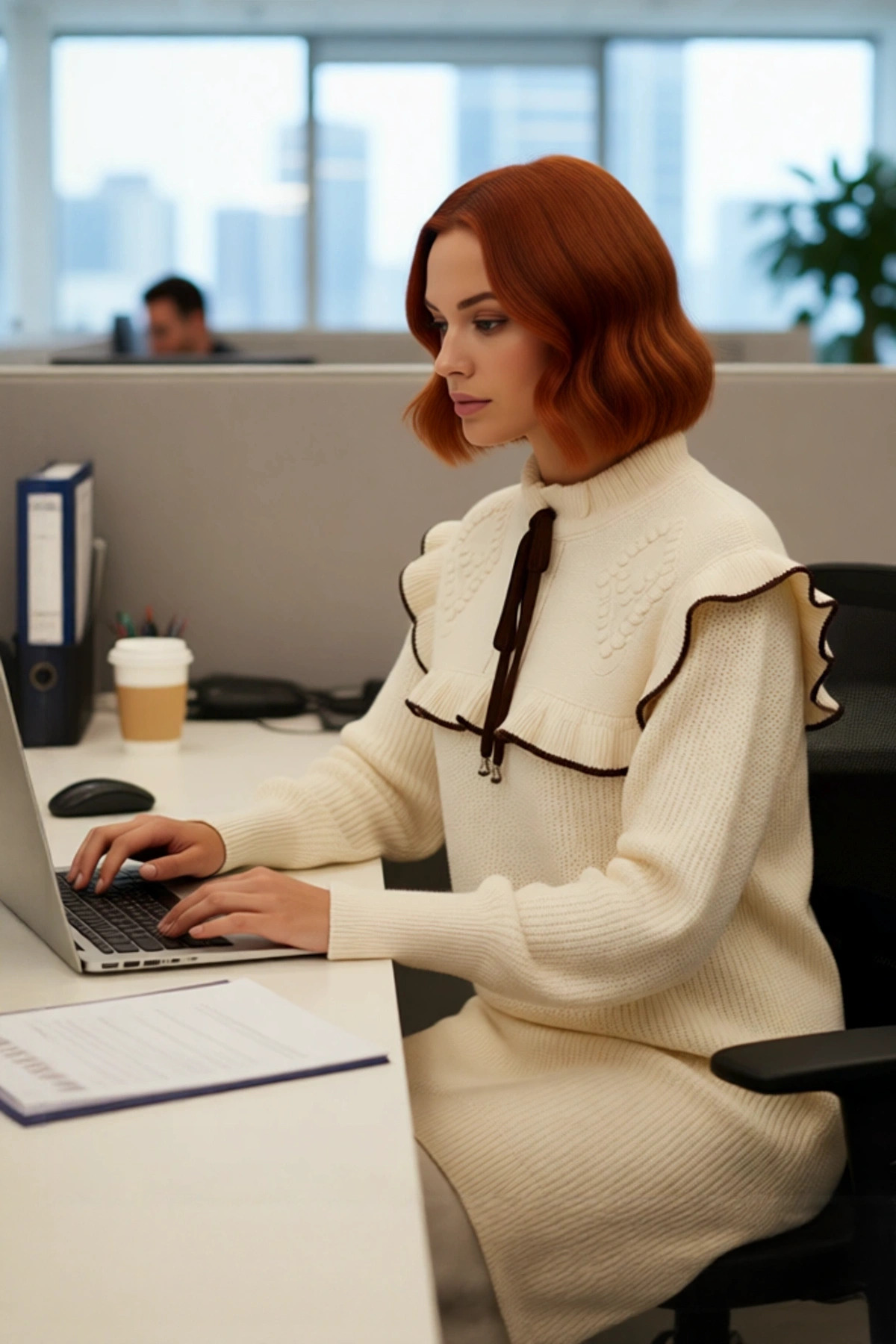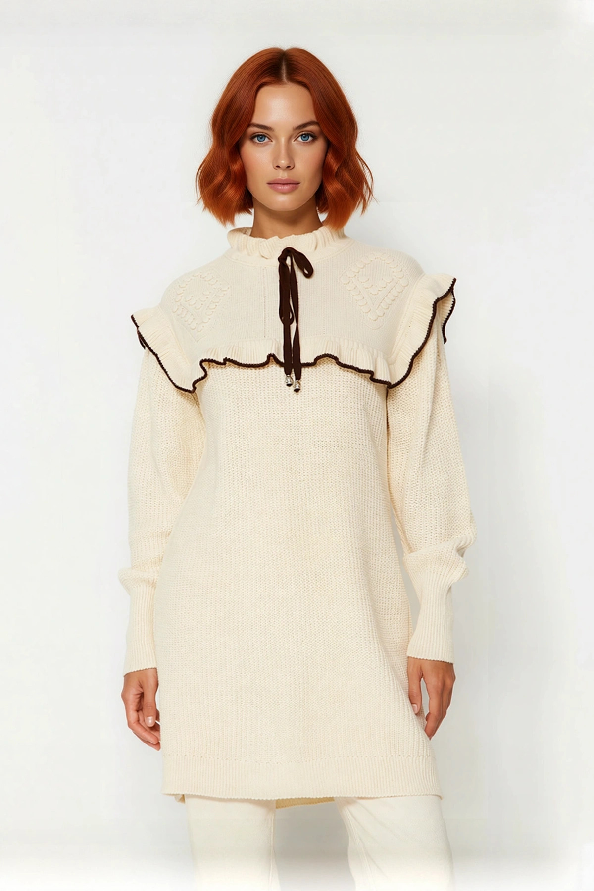 Ürün Özellikleri: Regular kalıp, akrilik materyal, saç örgü desen, dik yaka, düşük kol, triko kumaş, krem renk, biyeli detay.