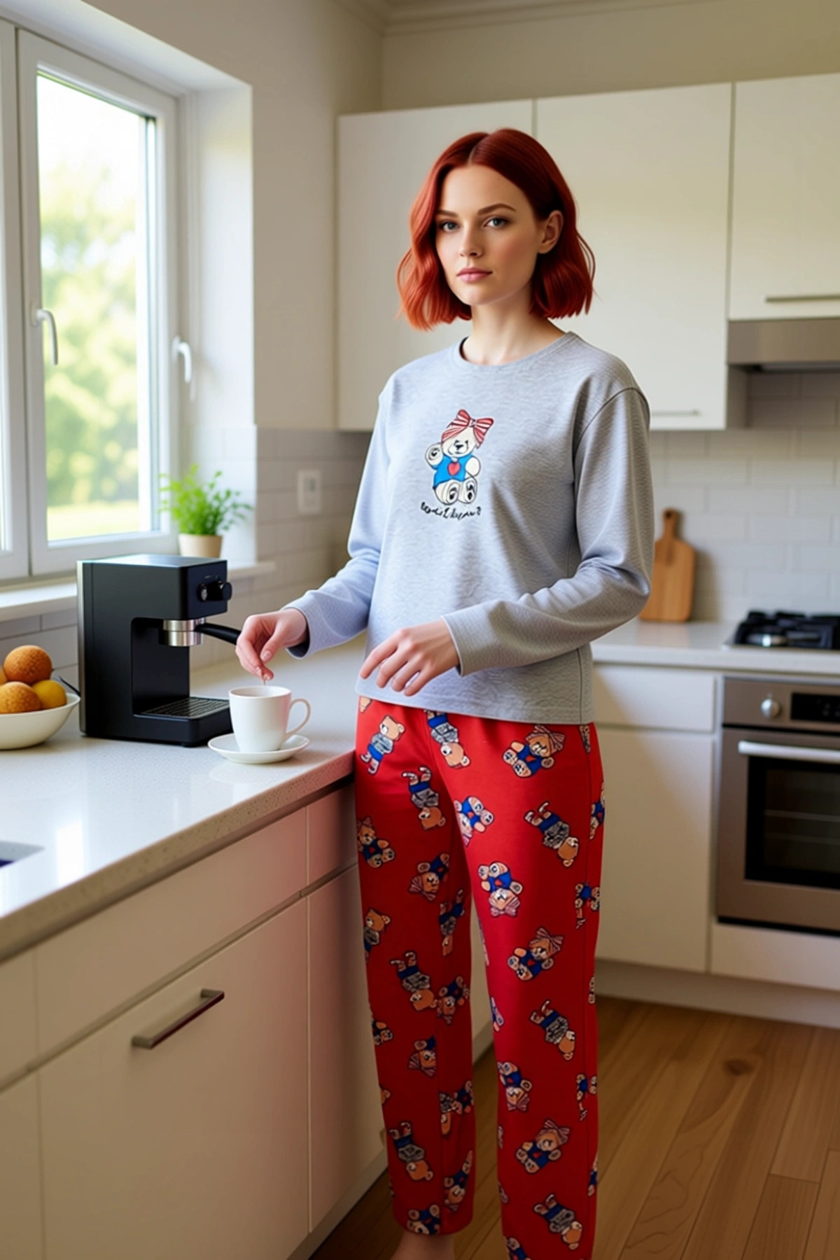 Bu kadın pijama takımı, ev giyiminde eğlenceli ve rahat bir seçenek sunuyor. Üst parça, bisiklet yakası ve uzun kollu tasarımıyla klasik bir görünüm sunarken, üzerinde yer alan sevimli ayıcık baskısı takıma neşeli bir hava katıyor. Alt parça ise canlı kırmızı rengi ve tüm yüzeyini kaplayan tekrar eden ayıcık desenleriyle dikkat çekiyor. Regular fit kalıbı, her vücut tipine uyum sağlayarak rahat bir kullanım vadediyor. %78 pamuk ve %22 polyester karışımından oluşan örme süprem kumaş, yumuşak dokusu ve nefes alabilirliği ile ön plana çıkıyor. Bu pijama takımı, evde geçirilen zamanı daha keyifli hale getirmek için tasarlanmıştır. Metraj baskı tekniği ile uygulanan desenler, canlılığını uzun süre koruyarak ürünün estetik değerini artırır. Bu ürün, hem cool hem de konforlu bir stil arayan kadınlar için uygundur ve lounge/home ortamları için idealdir. Üst kısmın bisiklet yaka ve standart kol detayı, günlük kullanıma uygun bir rahatlık sunarken, alt kısmın boru paça kesimi hareket özgürlüğünü maksimize eder. Normal bel özelliği, gün boyu konforlu bir oturuş sağlar. Örme kumaşın yumuşaklığı, cildinize nazikçe dokunarak ekstra bir konfor deneyimi sunar. Bu pijama takımı, evde dinlenirken, kitap okurken veya günlük ev işlerinizi yaparken size eşlik edecek şekilde tasarlanmıştır. Esnek yapısı ve rahat kalıbı sayesinde kendinizi özgür ve rahat hissedeceksiniz. %78 pamuk %22 polyester materyal bileşeni, hem cildin nefes almasına olanak tanır hem de ürünün dayanıklılığını artırır, böylece uzun ömürlü bir kullanım sunar. Kış mevsiminde sıcak ve konforlu bir seçenek olan bu pijama takımı, soğuk havalarda bile sizi ısıtacaktır. Gri üst ve kırmızı altı, rahat bir jean pantolon, şık bir tayt veya kısa bir şort ile rahatlıkla kombinleyebilirsiniz. Evde terliklerle veya spor ayakkabılarla tamamlayacağınız bu takım, hem ev içinde hem de dışarıda rahat bir görünüm sunar. Ürünün bakımında kumaşın ömrünü uzatmak için hassas yıkama önerilir. Bu pijama takımı, kendiniz için veya sevdikleriniz için harika bir hediye seçeneği olabilir.