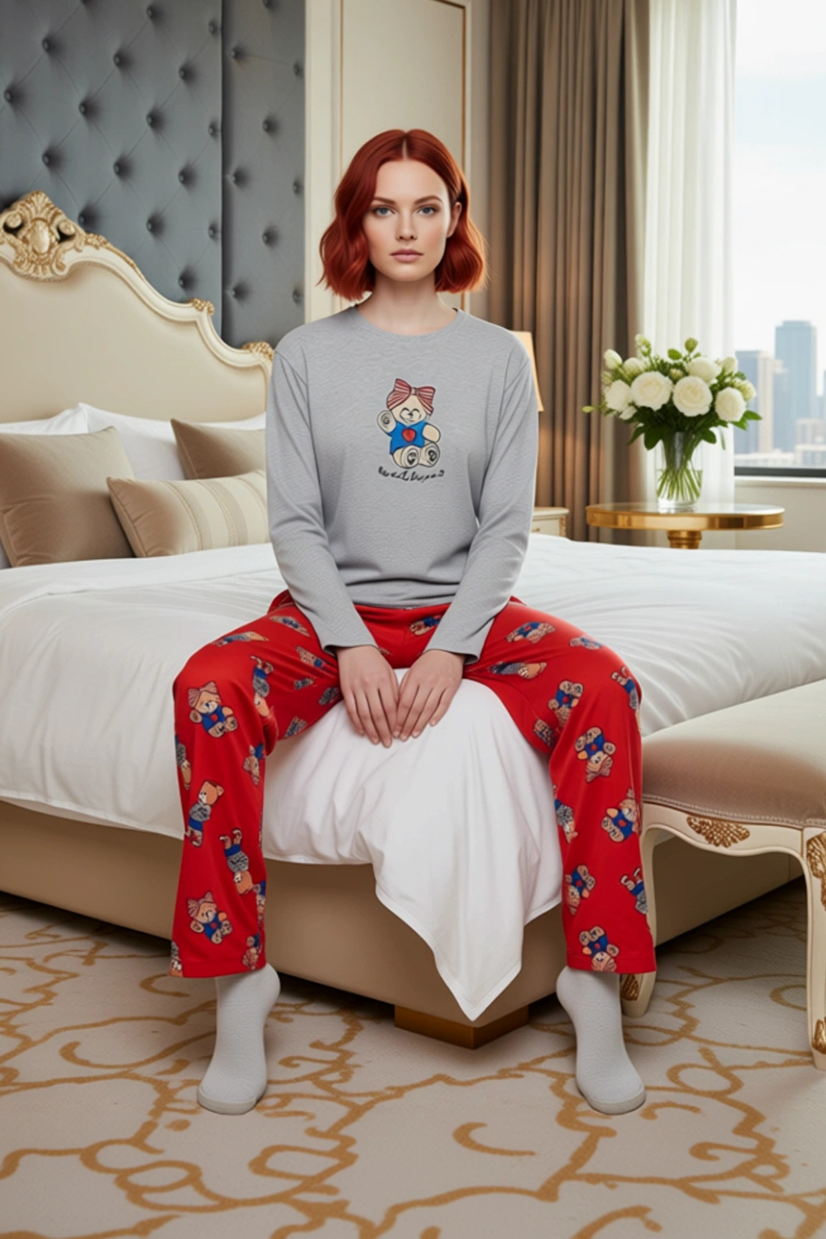 Kadın Ayıcık Desenli Pijama Takımı Bisiklet Yaka Uzun Kollu Fonksiyonel Dayanıklı Kaliteli