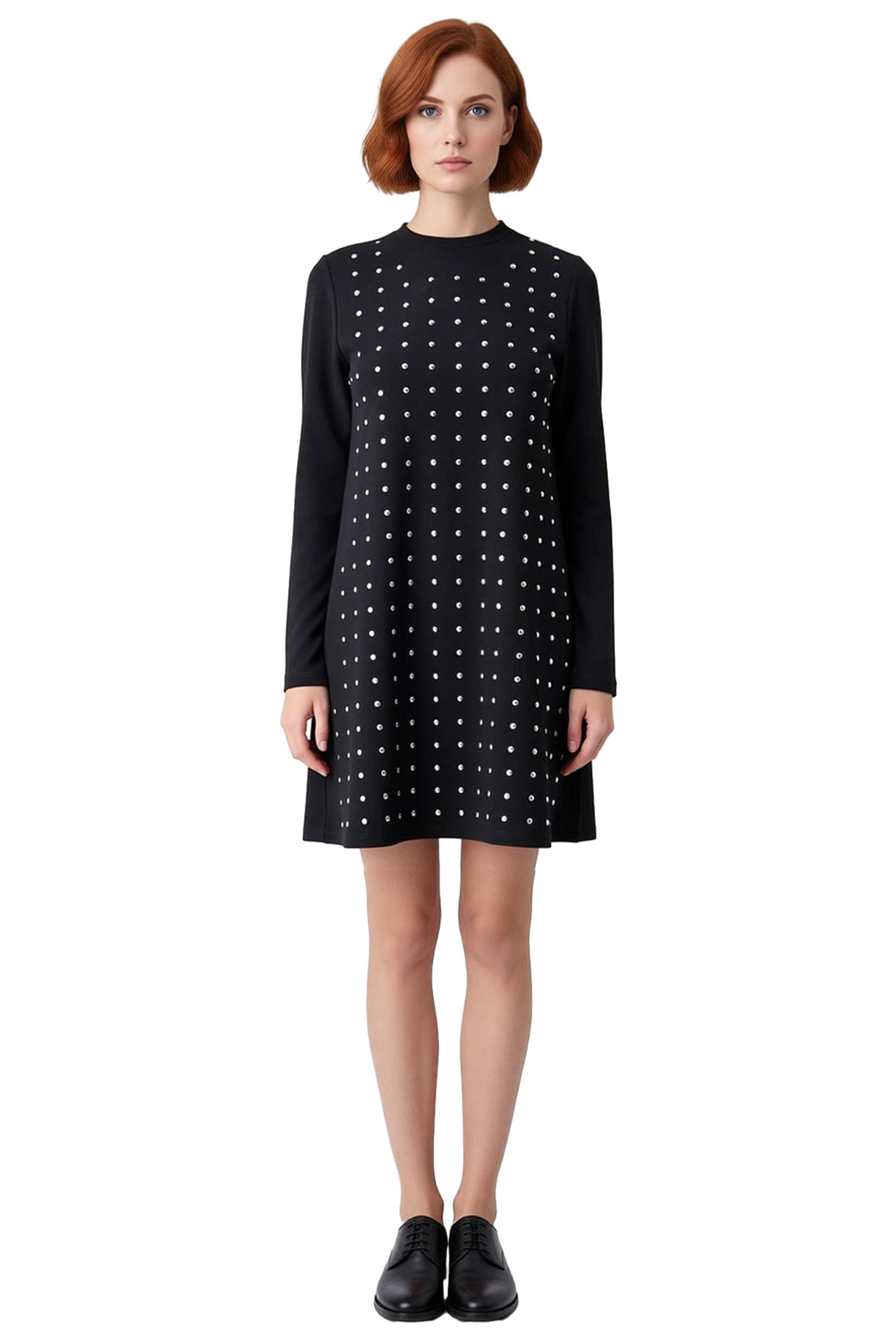 Ürün Özellikleri: Shift kalıp, %74 polyester %22 viskoz %4 elastan materyal, taş detaylı desen, bisiklet yaka, standart kol, örme kumaş, siyah renk, astarsız tasarım.