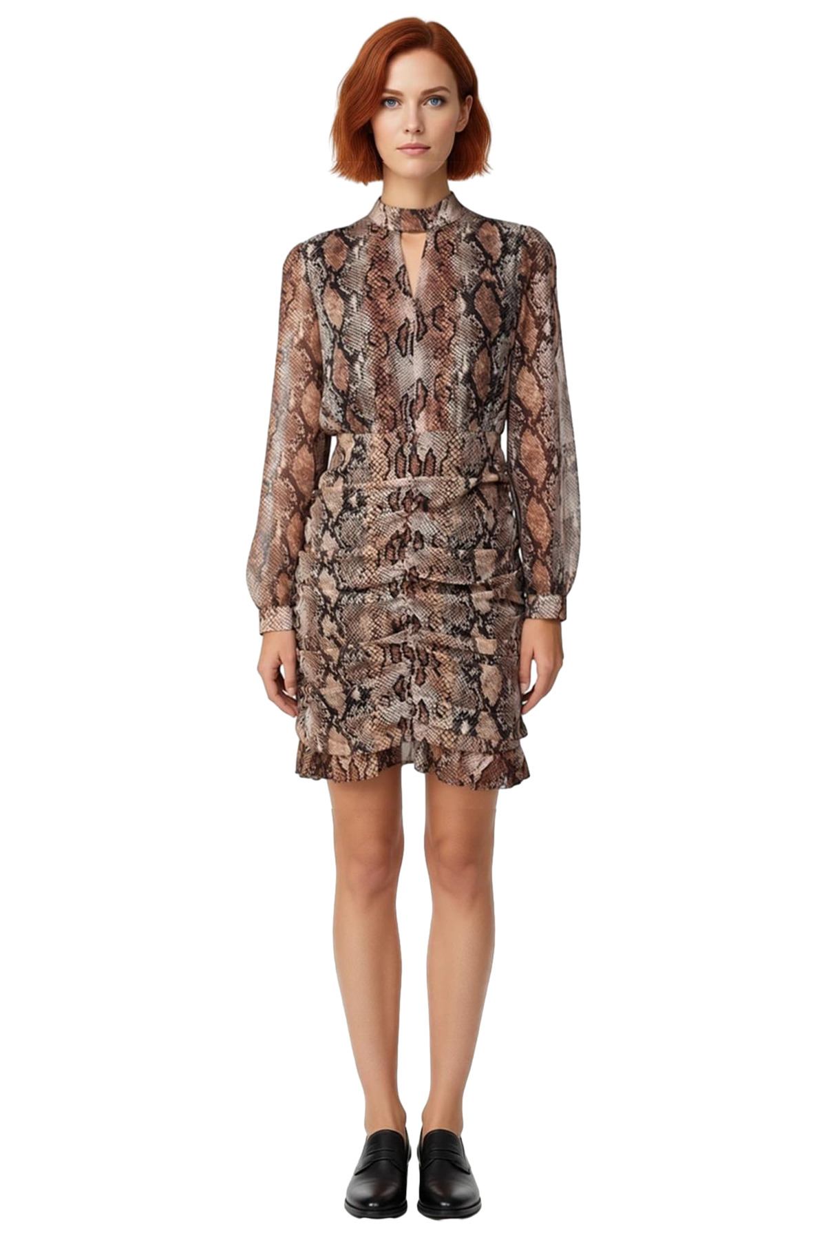 Ürün Özellikleri: Bodycon kalıp, %100 polyester materyal, animal desen, choker yaka, uzun balon kol, şifon dokuma kumaş, kahverengi renk, büzgülü detay, astarlı durum, kısa/mini boy.