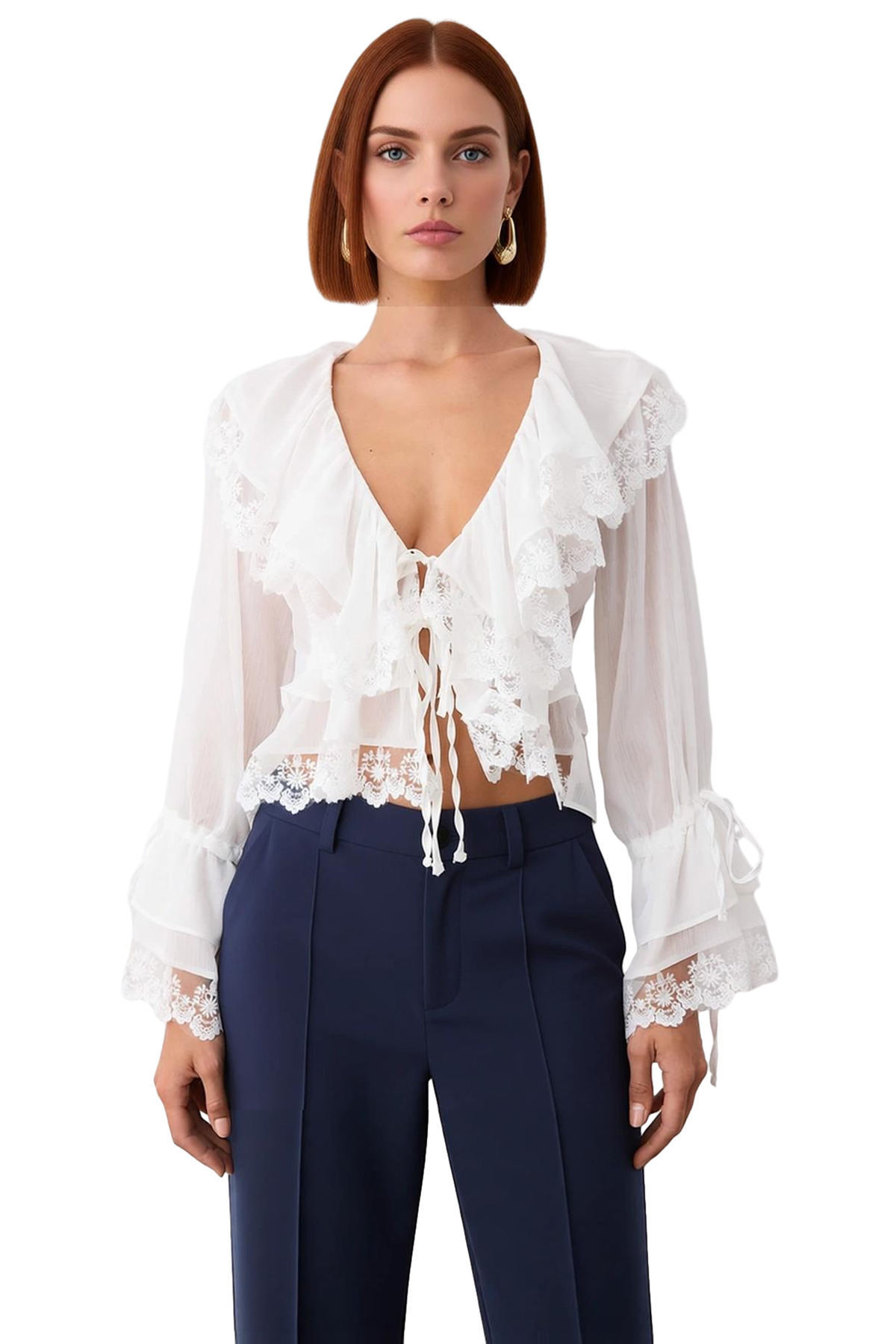 Bu kadın bluzu, zarafeti ve şıklığı bir araya getiren özel bir tasarıma sahiptir. V yaka ve bol fırfırlı ön kısmı, ürüne dramatik ve feminen bir görünüm kazandırır. Tamamen polyesterden üretilmiş, hafif ve dökümlü şifon kumaşı, özellikle sıcak yaz günlerinde serin ve rahat bir kullanım sunar. Uzun kolları, zarif dantel işlemeleriyle süslenmiş ve geniş manşetleriyle dikkat çekicidir. Bu detaylar, bluzun genel estetiğini güçlendirerek ona sofistike bir hava katar. Ön kısmındaki ip bağcık detayı, kullanıcının kendi tercihlerine göre yaka açıklığını ayarlamasına olanak tanır, bu da ürüne fonksiyonellik katar. Düz deseni, farklı kıyafetlerle kolayca uyum sağlamasına yardımcı olurken, regular kalıbı rahat bir kullanım deneyimi sunar. Bu bluz, özel günler, partiler veya şık bir akşam yemeği gibi etkinlikler için ideal bir seçenektir. Genç ve modern bir stil arayan kadınlar için tasarlanmış olup, yaz sezonunun vazgeçilmez parçalarından biri olmaya adaydır. Türkiye’de üretilen bu ürün, yüksek kaliteli malzemeler ve işçilikle hazırlanmıştır. Bakım talimatları Hassas Yıkama olarak belirtilmiştir, bu da ürünün kolaylıkla temizlenebileceğini gösterir. Bu bluz, kadınların gardıroplarına hem zarafet hem de özgünlük katacak bir parçadır. Şifonun hafifliği ve dantelin narinliği, bu ürünü özel kılan unsurlardır. Farklı kombinlerle zenginleştirilerek kişisel tarzınızı yansıtmanıza olanak tanır.