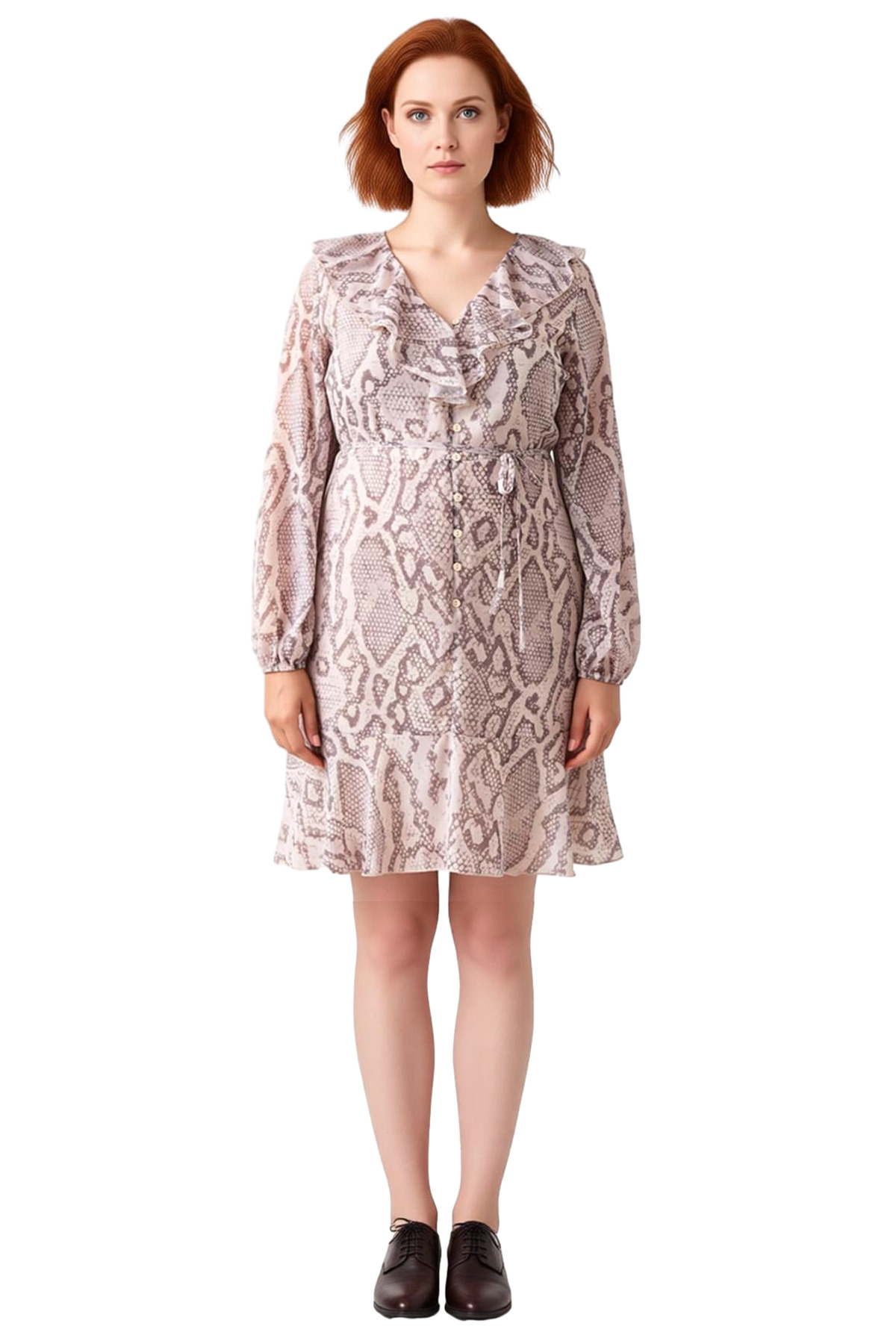 Bu kadın elbisesi, şık ve modern A-line kesimi ile her bedene zarif bir uyum sağlar. Göz alıcı animal deseni ve çok renkli yapısıyla stilinize dinamik bir dokunuş katarken, %100 polyester şifon dokuma kumaşı sayesinde hafif ve konforlu bir giyim deneyimi sunar. V yaka tasarımı feminen bir hava verirken, volanlı detaylar elbiseye hareket ve çekicilik katar. Günlük kullanıma uygun yapısıyla hem rahat hem de trend bir görünüm arayan kadınlar için ideal bir seçimdir. Bu elbise, her an şık ve özenli görünmenizi sağlayan zamansız bir parçadır.