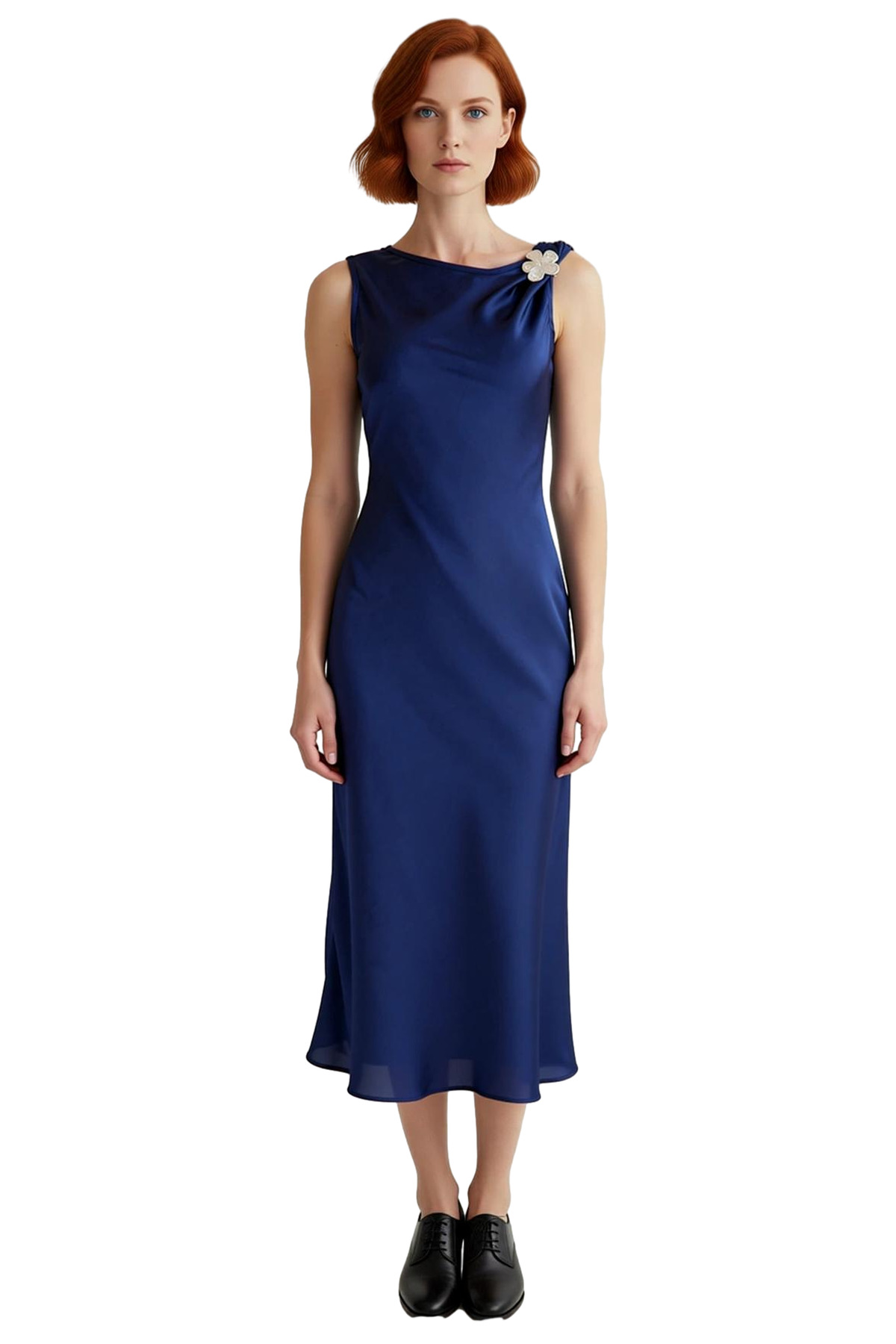 Ürün Özellikleri: Shift kalıp, polyester materyal, düz desen, asimetrik yaka, kolsuz kol, dokuma saten kumaş, lacivert renk, maxi boy, aksesuar detaylı, astarsız.