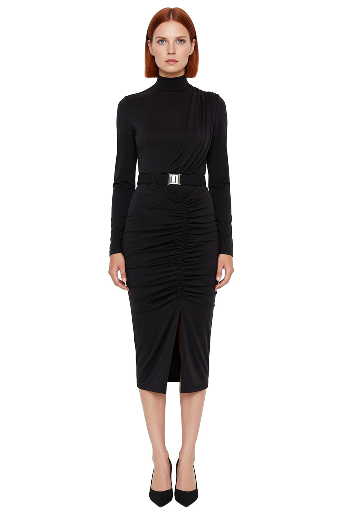 Kadın Şık Dik Yaka Kemerli Drapeli Vücuda Oturan Midi Örme Elbise Uzun Kollu Zarif Stil Kaliteli