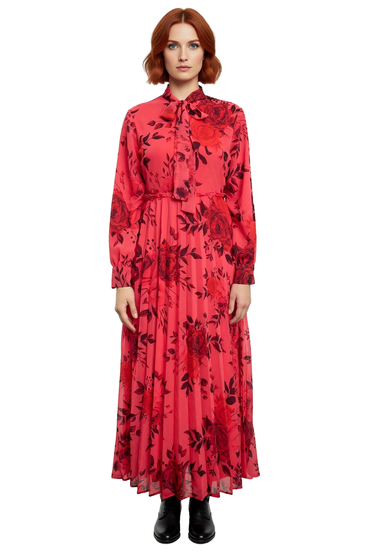 Elbisenin boyundan bağlamalı yaka detayı, klasik şıklığı modern bir yorumla birleştirerek göz alıcı bir görünüm sunar. Uzun balon kol tasarımı, hacimli duruşuyla güncel moda trendlerini yansıtırken, hareket özgürlüğünü kısıtlamaz. Cepsiz yapısıyla elbisenin akışkan ve temiz hatları korunurken, dokuma şifon kumaşının hafifliği ve piliseli eteklerin dinamik salınımı ile her anınızda fark yaratırsınız. Dayanıklı %100 polyester materyal sayesinde uzun ömürlü kullanım sunan bu elbise, makinede yıkanabilir olmasıyla da bakım kolaylığı sağlar.
