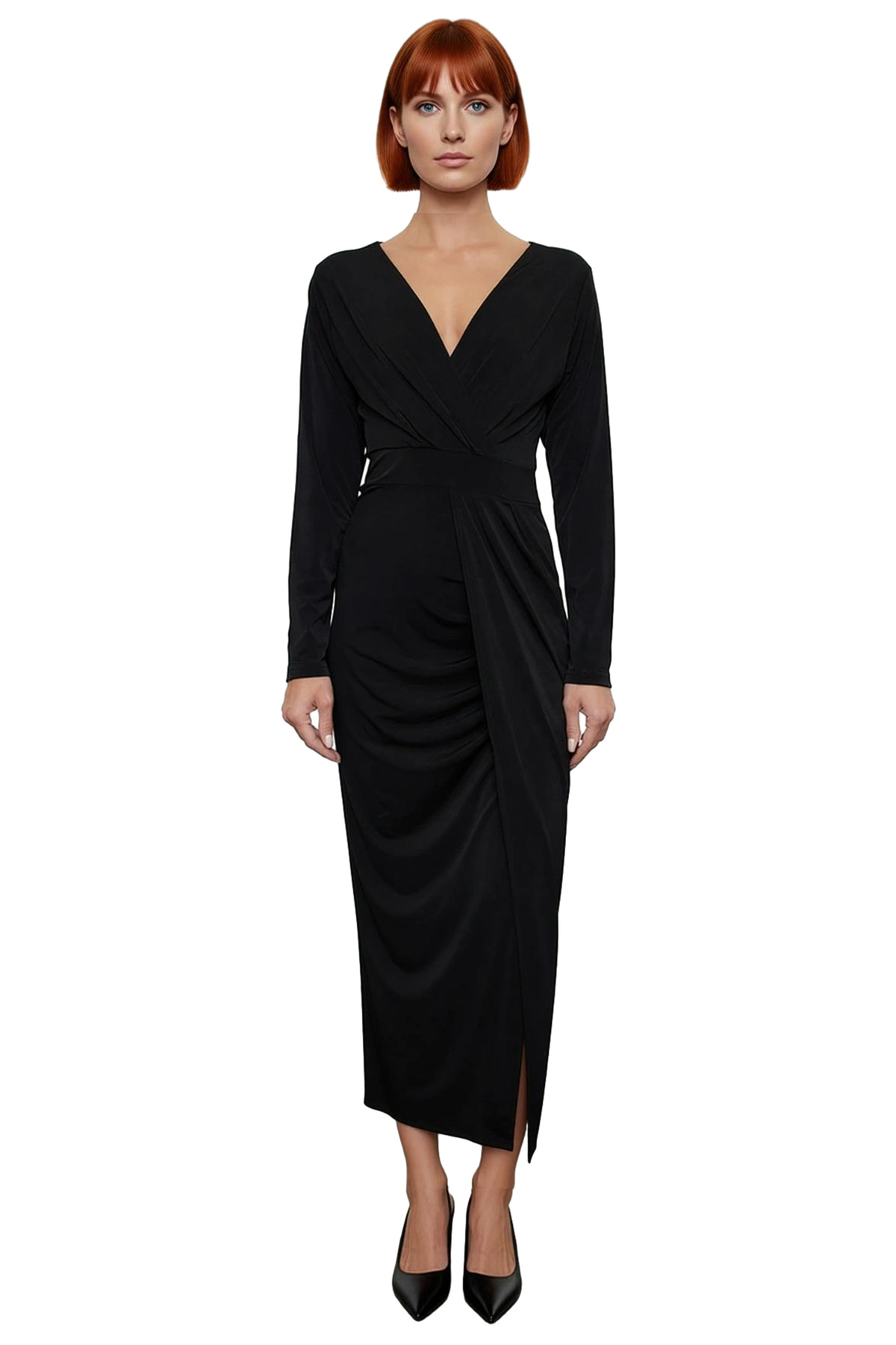 Ürün Özellikleri: Bodycon kalıp, polyester materyal, düz desen, kruvaze yaka, standart kol, örme sandy kumaş, siyah renk, baskısız tasarım.