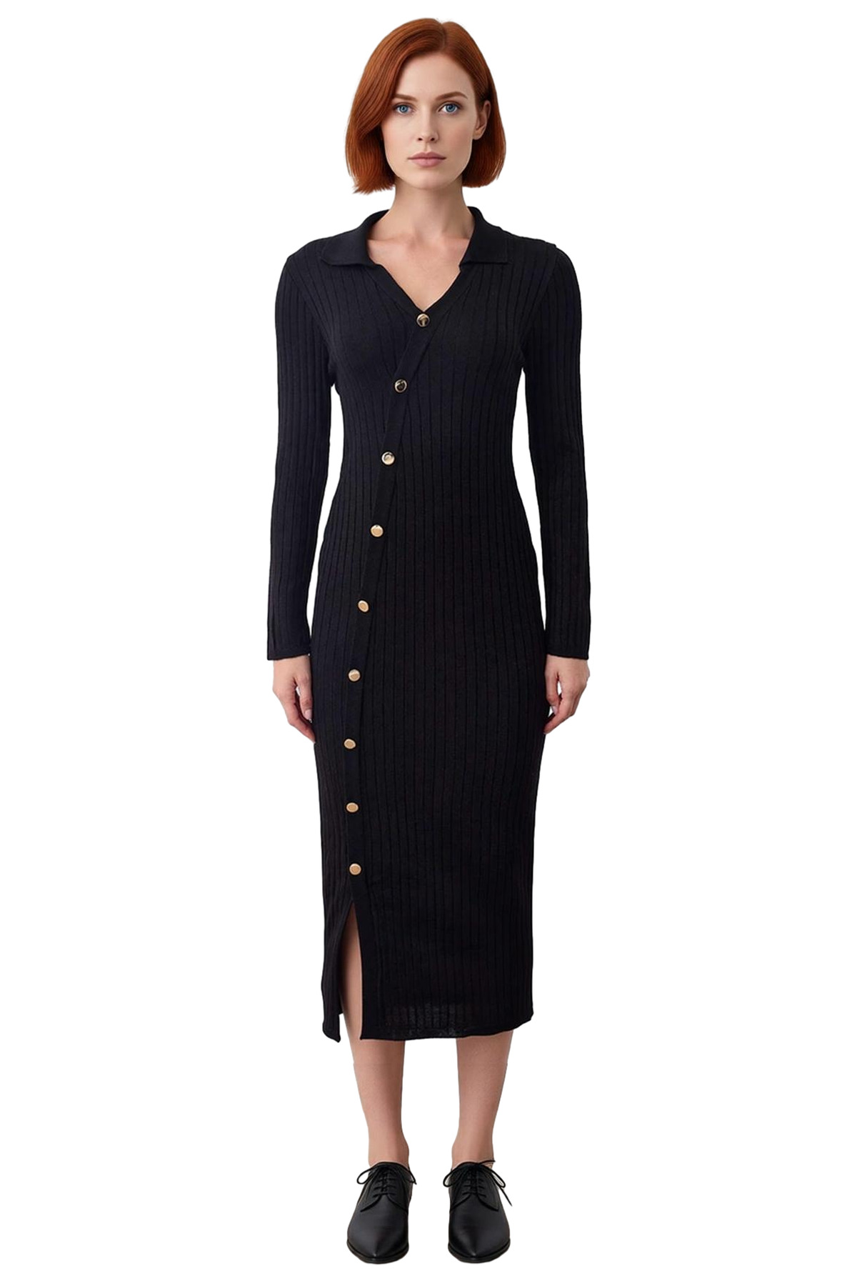 Ürün Özellikleri: Bodycon kalıp, 100% akrilik materyal, düz desen (fitilli ve düğme detaylı), V yaka (yakalı), standart kol, triko kumaş, siyah renk.