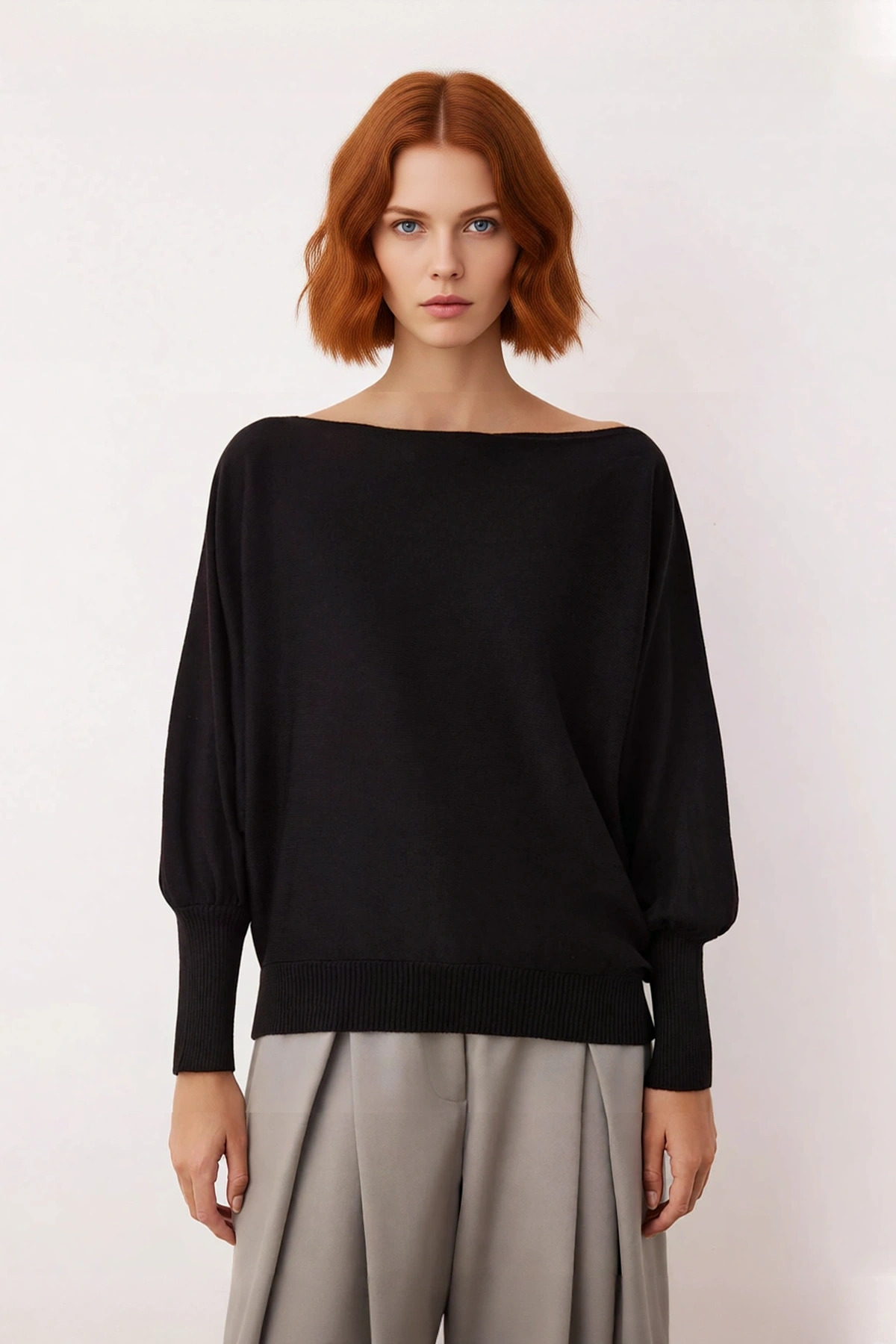 Ürün Özellikleri: Oversize kalıp, 100% Akrilik materyal, düz desen, kayık yaka, yarasa kol, triko kumaş, siyah renk, regular boy.