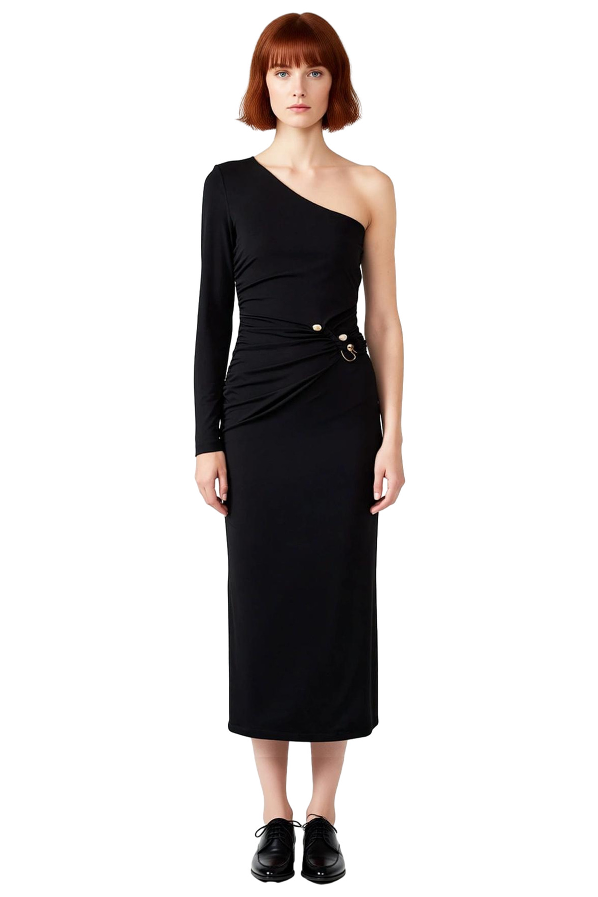 Ürün Özellikleri: Bodycon kalıp, %96 polyester %4 elastan materyal, düz desen, asimetrik yaka, tek kol, uzun kol boyu, örme sandy kumaş, astarlı, aksesuar detaylı.
