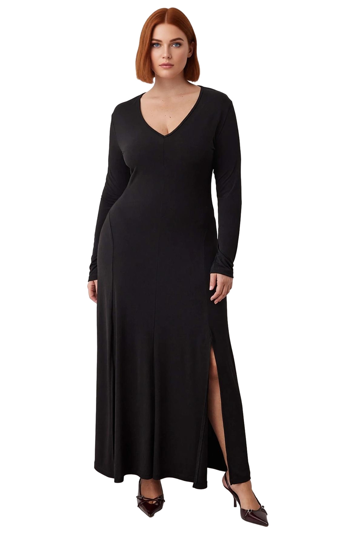 Zarafet ve konforu bir araya getiren bu kadın maxi elbise, A-kesim kalıbıyla bedeninizi nazikçe sararak modern ve şık bir duruş sergiler. %96 polyester ve %4 elastan karışımı materyali sayesinde gün boyu rahatlık sağlarken, esnek yapısıyla hareket özgürlüğünüzü destekler. Sade ve düz deseni, zamansız siyah rengiyle birleşerek her stile kolayca adapte olabilen sofistike bir görünüm sunar. V yaka tasarımı, feminen bir dokunuş katarken, kış ve geçiş mevsimlerinde ideal bir seçimdir.