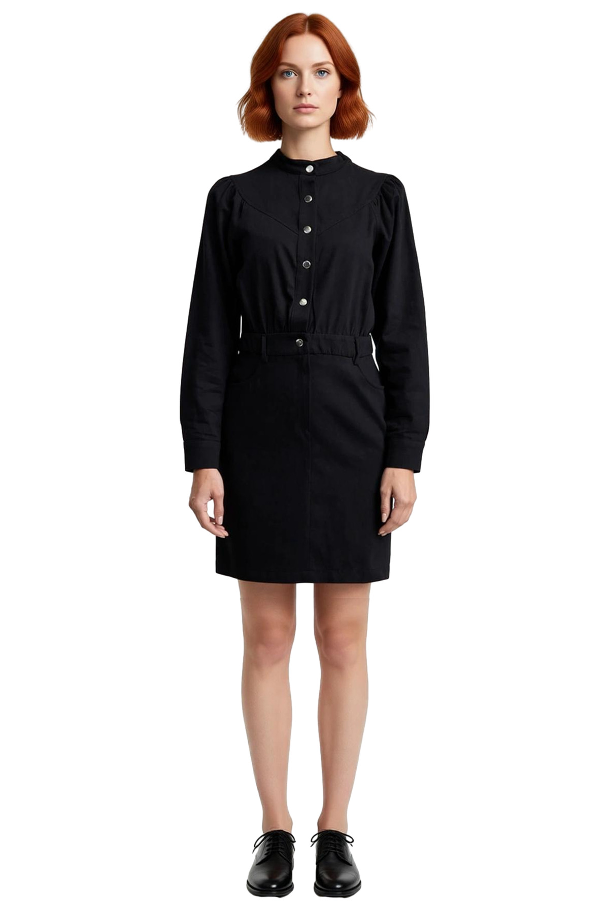 Dik yaka detayı elbiseye çağdaş bir hava katarken, ön kısmındaki metal çıtçıt düğmeler pratik kullanım ve stil sahibi bir görünüm sunar. Uzun standart kolları, soğuk hava koşullarına karşı ideal bir koruma sağlarken, hareket özgürlüğünüzü kısıtlamaz. Yanlarda yer alan iki adet fonksiyonel cep, günlük ihtiyaçlarınızı yanınızda taşımanız için pratik çözümler sunar. Astarsız yapısı sayesinde hafif ve nefes alabilir bir giyim deneyimi sunan bu elbise, kolay bakımıyla da öne çıkar.