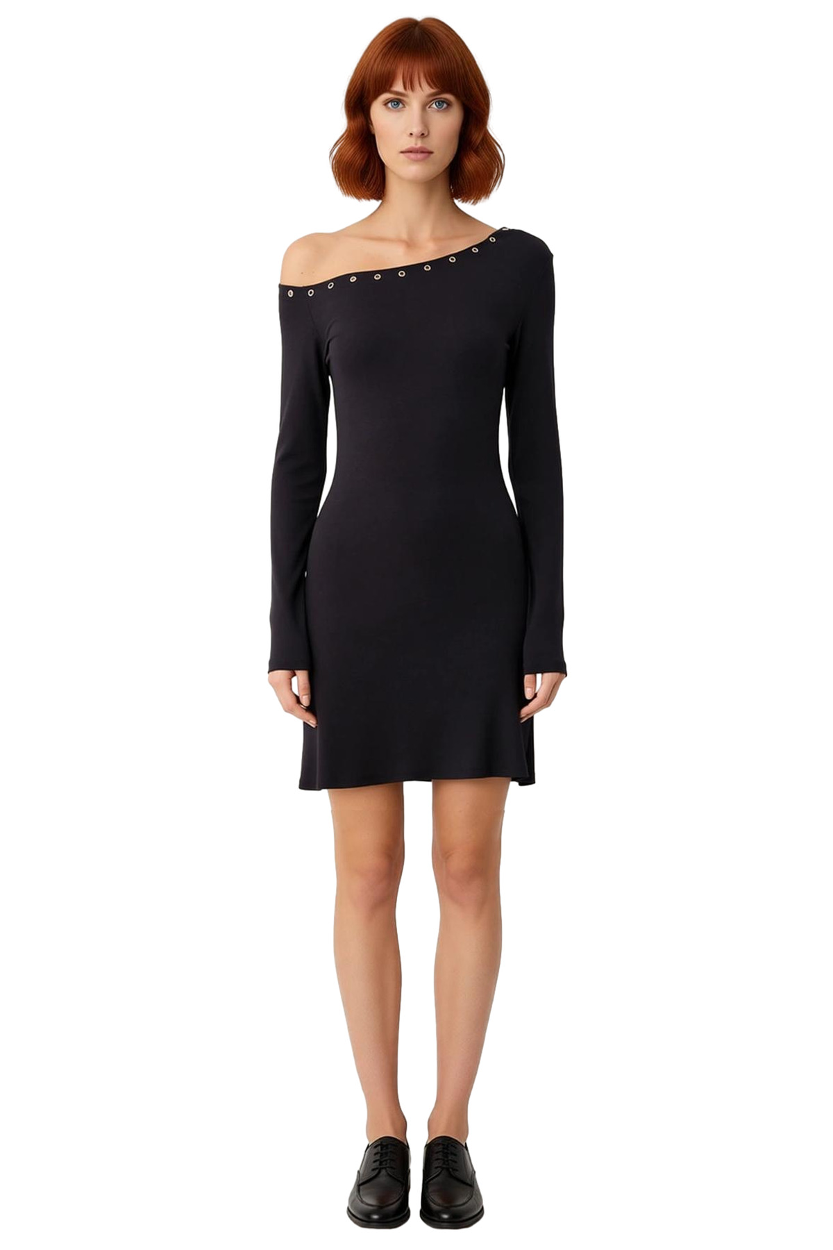 Kadın Siyah Asimetrik Yaka Örme Elbise Düz Desen Uzun Düşük Kol Aksesuar Detaylı Modern Kısa Boy - Görsel 2