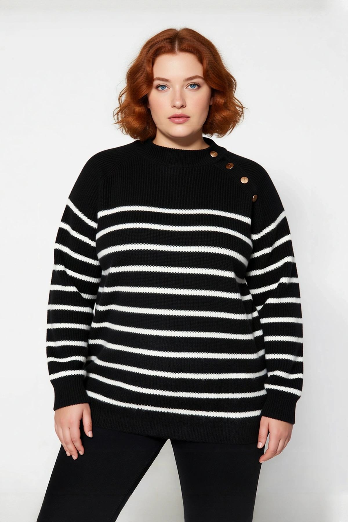 Ürün Özellikleri: Fitted kalıp, şardon akrilik materyal, çizgili desen, bisiklet yaka, standart kol, triko kumaş, siyah renk, baskısız tasarım, gold düğme detaylı.
