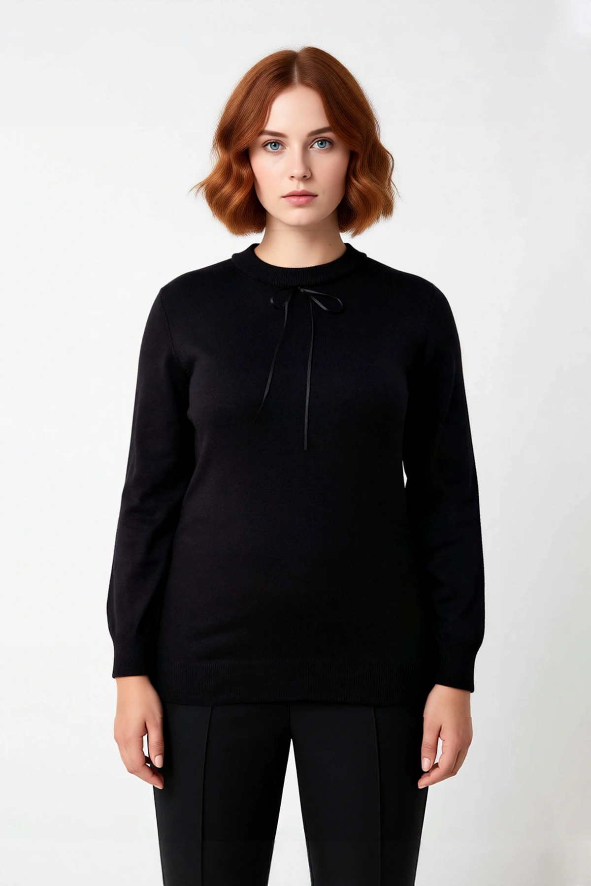 Ürün Özellikleri: Regular kalıp, akrilik materyal, düz desen dantel ve kurdele detaylı, bisiklet yaka, standart kol, triko kumaş, siyah renk.