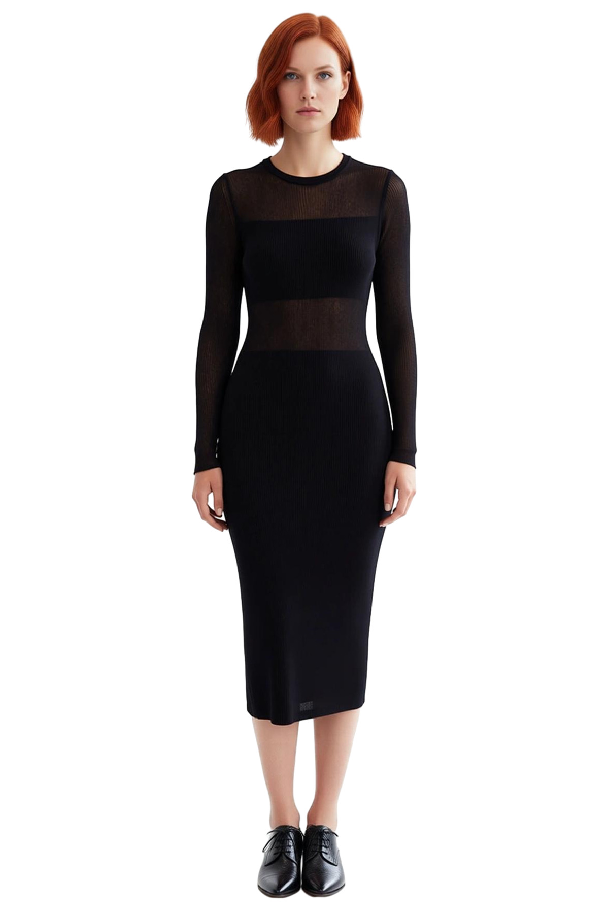 Kadın Siyah Midi Triko Elbise Transparan Detaylı Bodycon Kalıp Uzun Kollu Şık Bisiklet Yaka Günlük