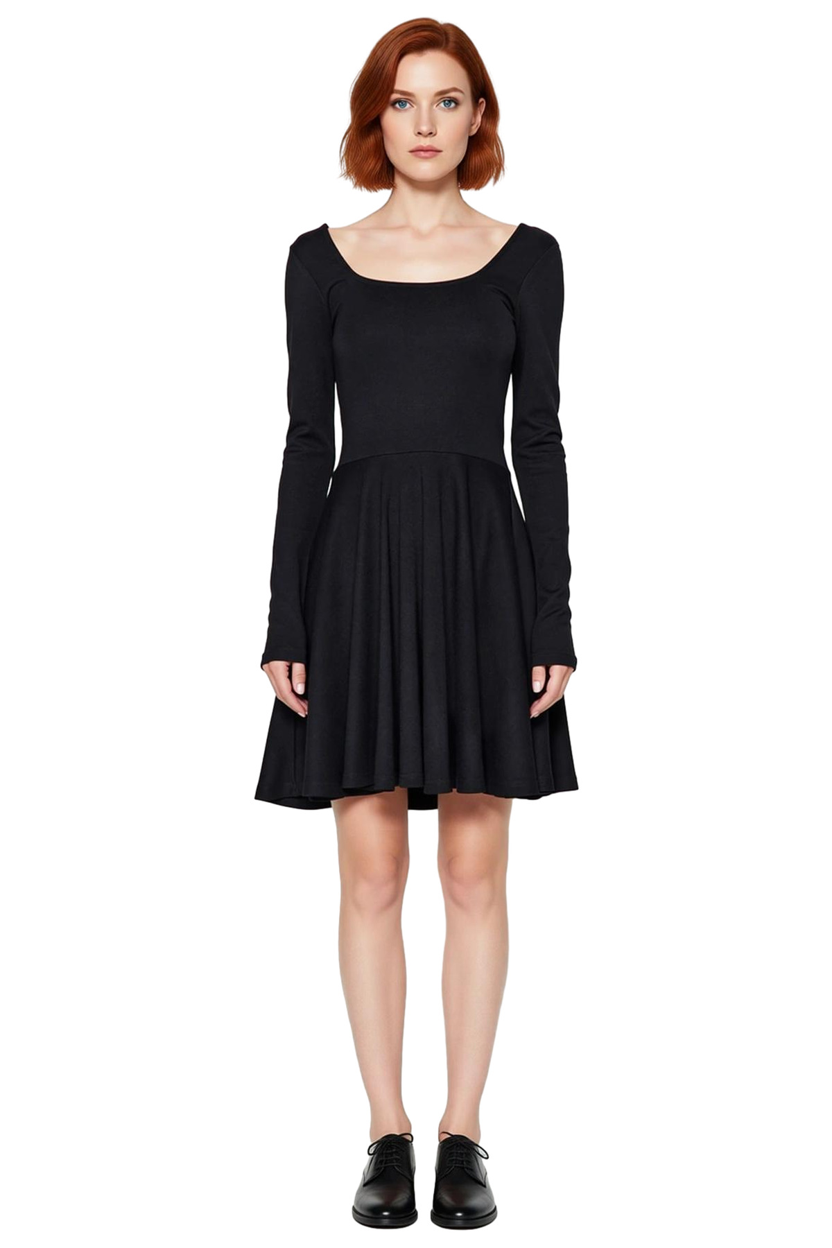 Ürün Özellikleri: Skater kalıp, polyester karışımlı materyal, düz desen, kare yaka, uzun standart kol, örme interlok kumaş, siyah renk.