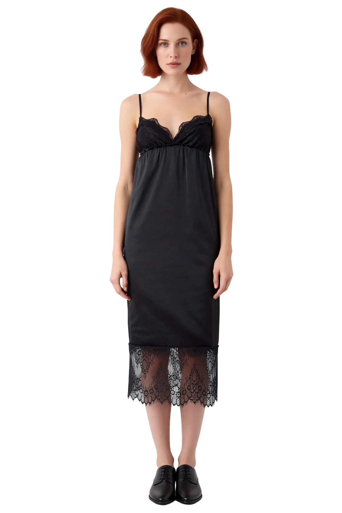 Ürün Özellikleri: Shift kalıp, 100% polyester materyal, düz desen, dantel detaylı V yaka, ince askılı kol, dokuma saten kumaş, siyah renk.