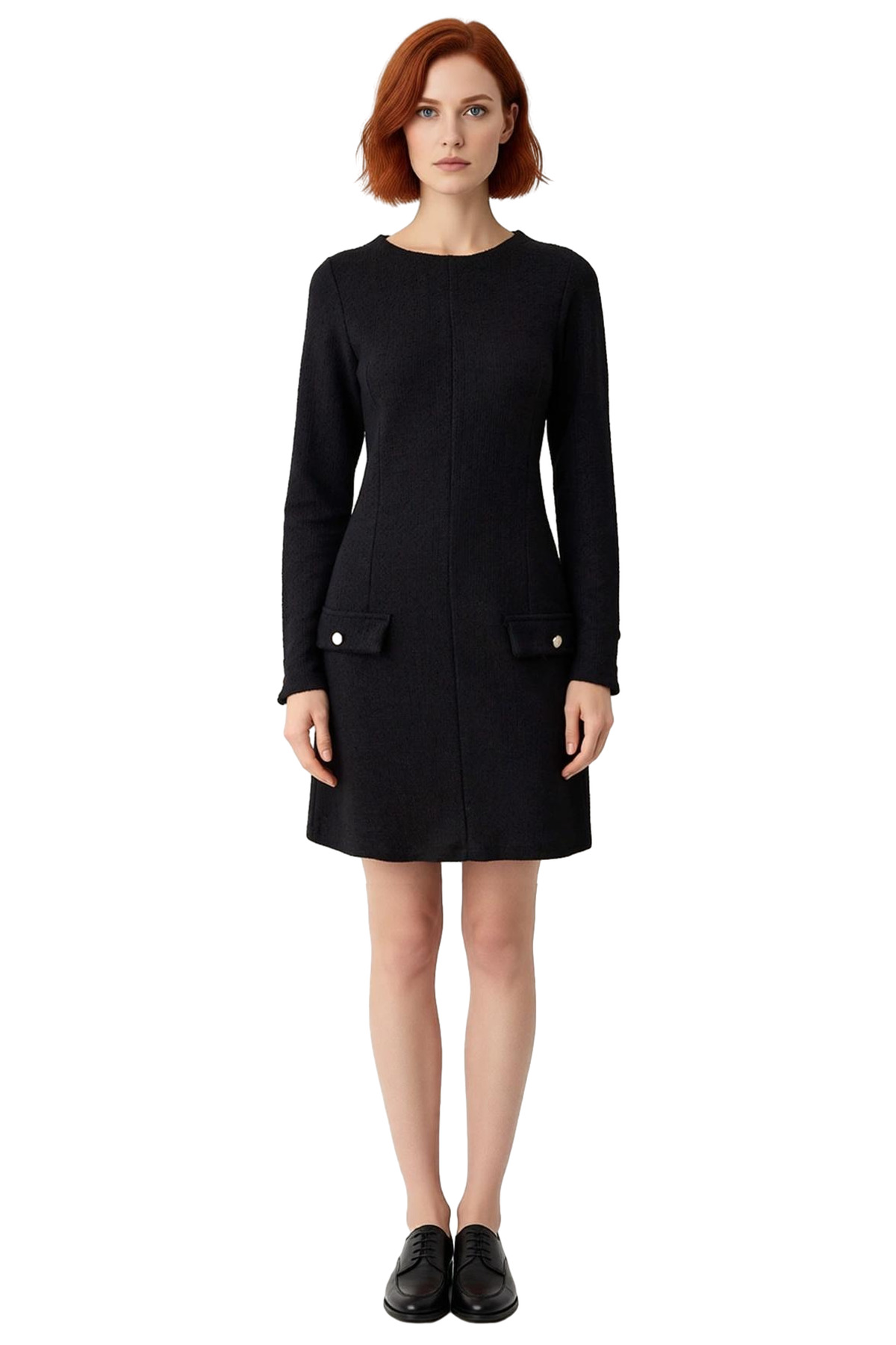 Kadınlar için tasarlanmış bu şık ve fonksiyonel elbise, modern shift kalıbı sayesinde vücuda rahat bir oturuş sunar ve her bedene uyum sağlar. Tüvit dokuma tipi ve örme kumaş özelliğiyle kış aylarında sizi sıcak tutarken, 55% pamuk ve 45% polyester karışımı materyali yumuşak bir dokunuş ve gün boyu konfor hissi verir. Düz siyah rengi, gardırobunuzdaki diğer parçalarla kolayca kombinlenebilirken, cep detayları ve altın düğmeleri elbiseye lüks bir hava katarak smart bir görünüm sunar.