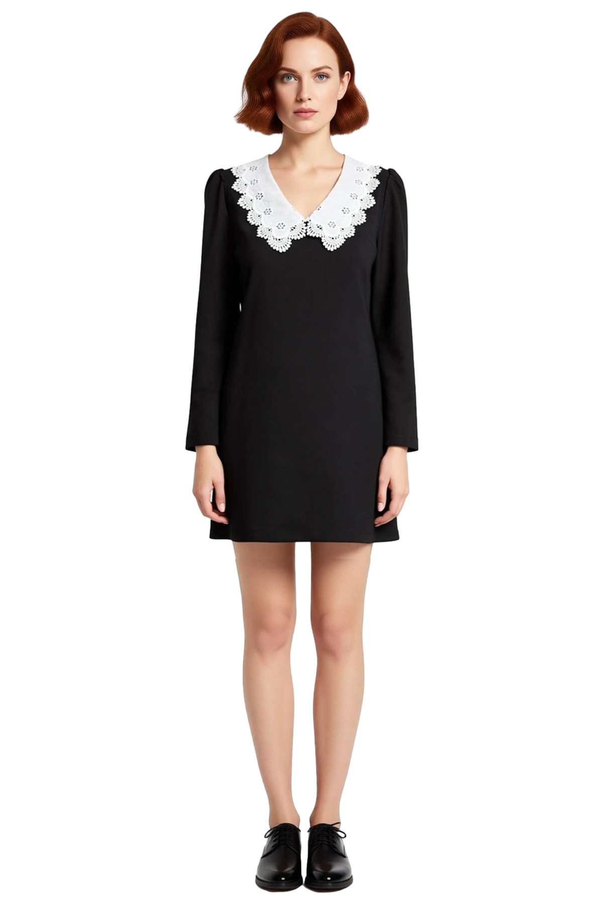 Zarif detayların ve modern kesimin birleştiği bu Kadın Siyah Uzun Kollu A Kesim Mini Elbise, şıklığı ve konforu bir arada sunar. Yüksek kaliteli polyesterden üretilmiş dokuma kumaşı, yumuşak dokusuyla cildinize narin bir his verirken, uzun süreli kullanım için dayanıklılık sağlar. Elbisenin en çarpıcı özelliği olan beyaz nakış detaylı yakası, klasik V yaka üzerine zarifçe yerleşerek her ortamda fark yaratmanızı garantiler. Düz siyah rengi, bu özel yaka detayının tüm ihtişamını sergilemek için mükemmel bir zemin oluşturur.