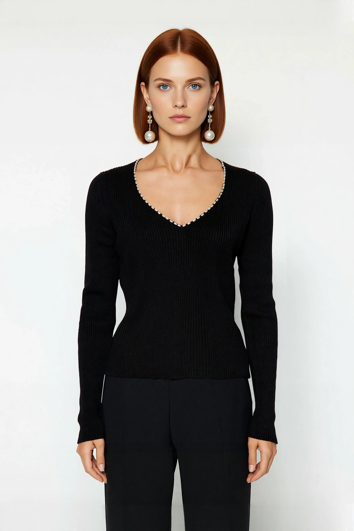 Kadın Siyah V Yaka İnci Detaylı Fitted Triko Kazak Uzun Kollu Kışlık Zarif Basic Model Kaliteli