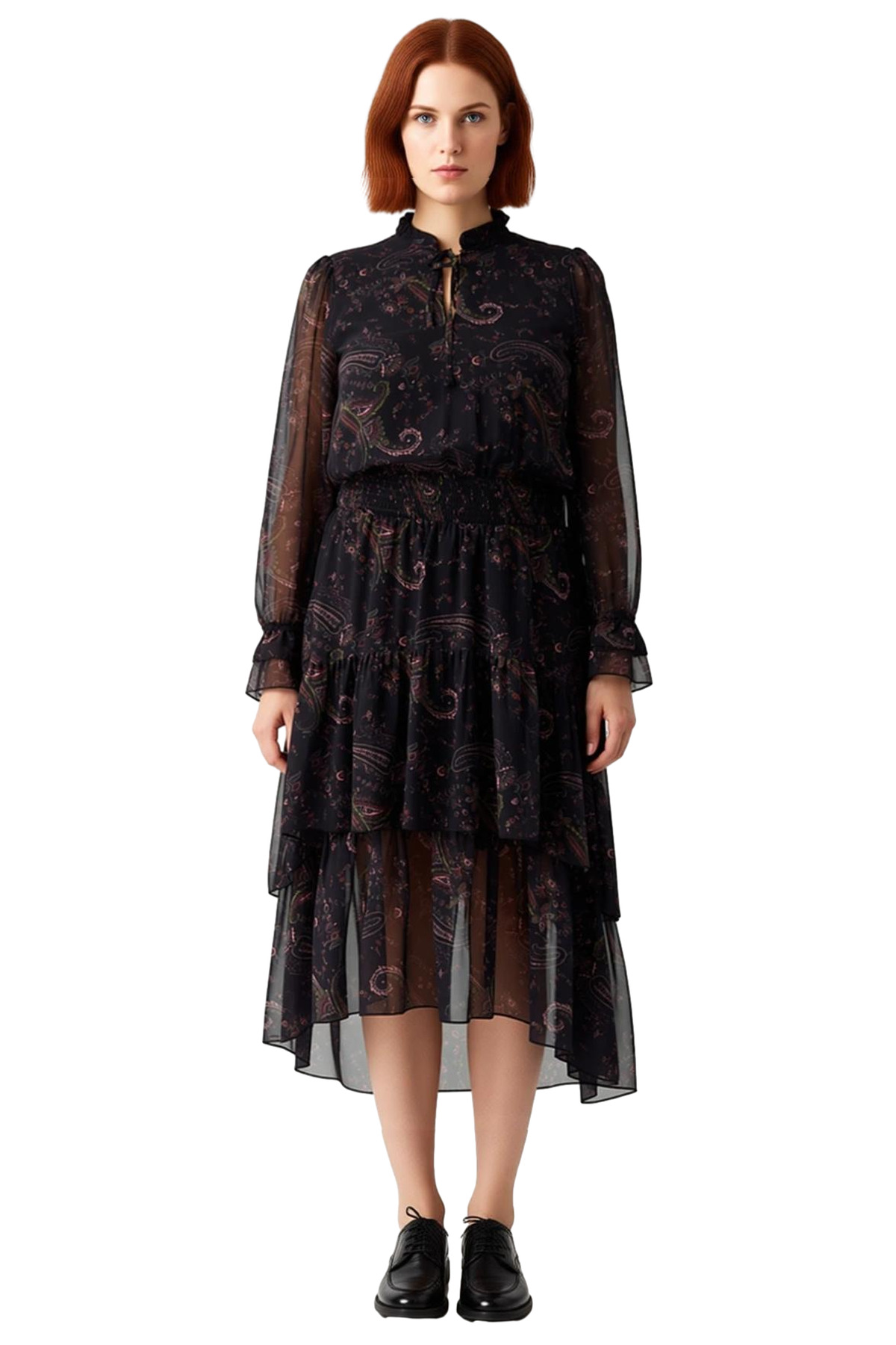 Boyundan bağlamalı yaka tipi, elbiseye sofistike bir hava katarken, standart uzun kolları şıklığı tamamlar. Dokuma kumaşın hafif ve hava alan yapısı, gün boyu konfor sağlarken, midi boyu modern ve trend bir görünüm sunar. Bu eşsiz tasarım, şifon dokumasının zarif düşüşüyle her adımda büyüleyici bir etki yaratır. T10 yıkama talimatı sayesinde kolayca temizlenebilir ve uzun yıllar formunu korur, kalitesiyle fark yaratır.