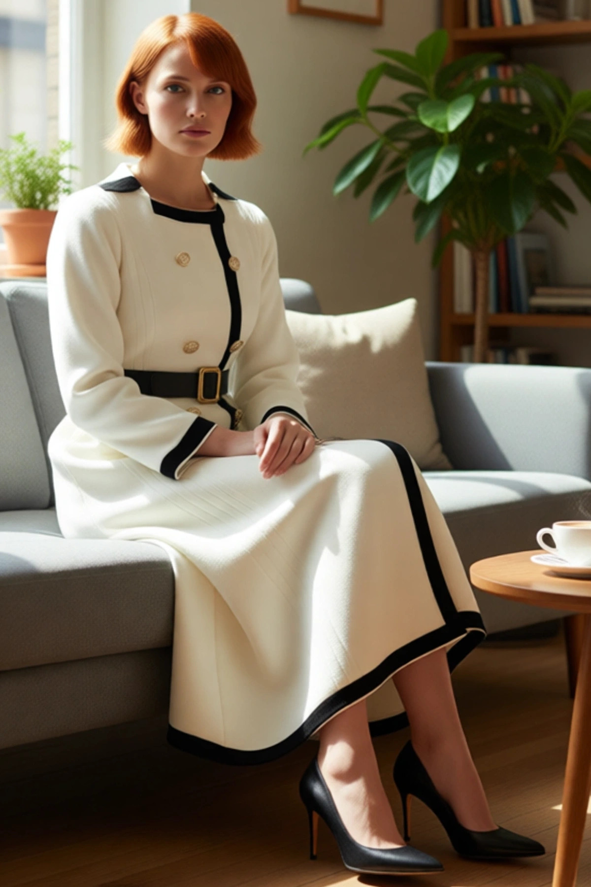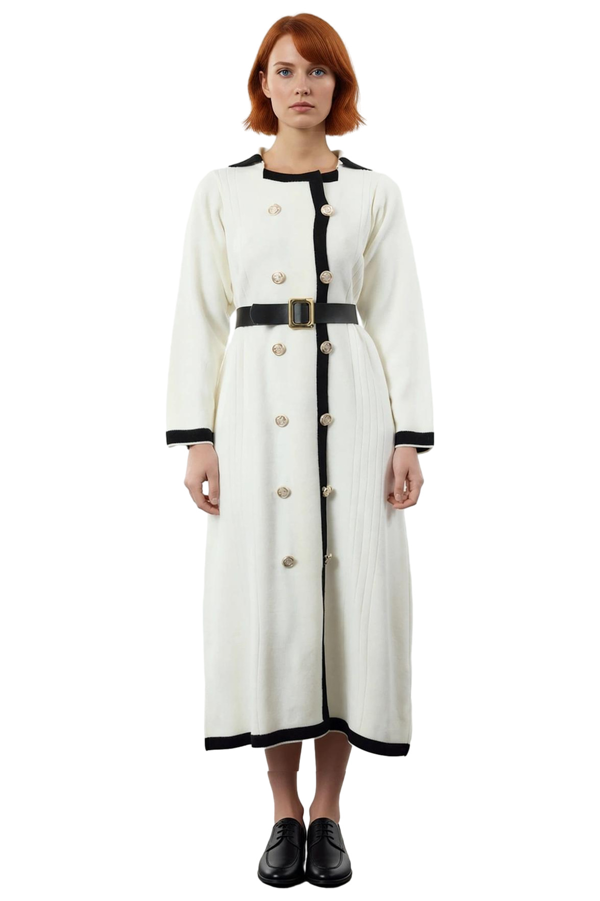 Ürün Özellikleri: A-line kalıp, 100% akrilik materyal, düz desen, ceket yaka, standart kol, triko kumaş, ekru renk, kuşaklı.
