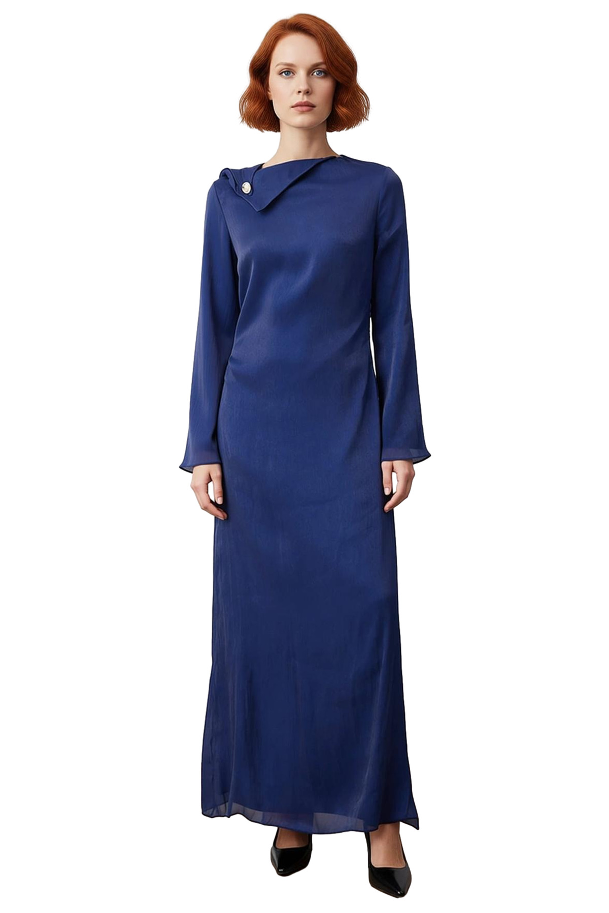 Bu elbise, kayık yaka tipi ile omuz ve boyun bölgesini zarif bir şekilde vurgularken, kolundaki ispanyol kol tipi tasarıma hareket ve şıklık katıyor. Dokuma kumaş yapısı, yoryo şifonun hafif ve dökümlü dokusuyla birleşerek elbiseye akışkan bir hava verir. Uzun kol boyu ve maxi kesimi, her mevsimde rahatlıkla tercih edilmesini sağlarken, astarlı yapısı sayesinde iç göstermez ve giyim konforunu artırır. Kaliteli polyester materyali, uzun ömürlü kullanım ve kolay bakım imkanı sunar.