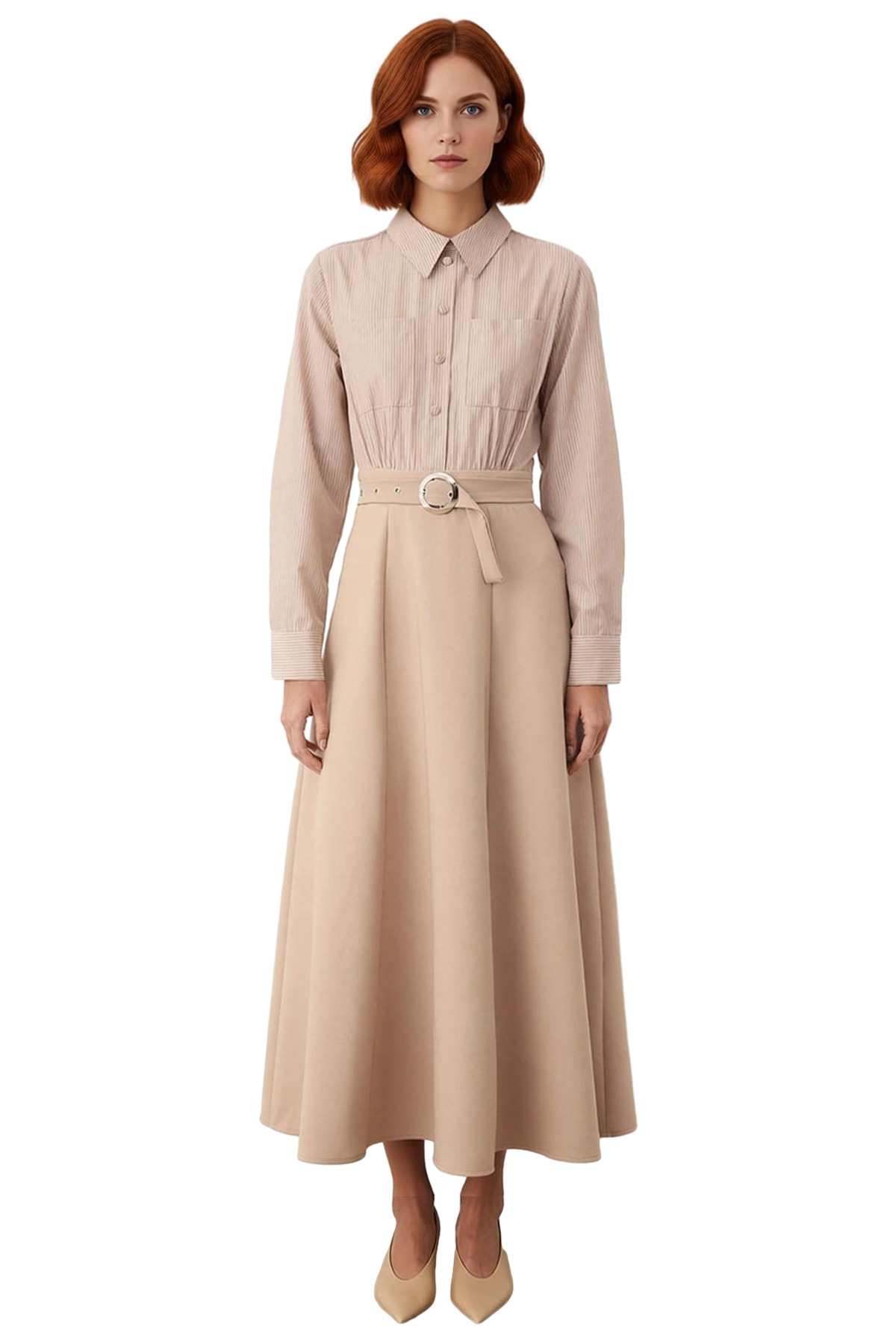 Ürün Özellikleri: Skater kalıp, dokuma materyal, çizgili desen, gömlek yaka, standart kol, dokuma kumaş, bej renk, kemer detaylı, maxi boy.