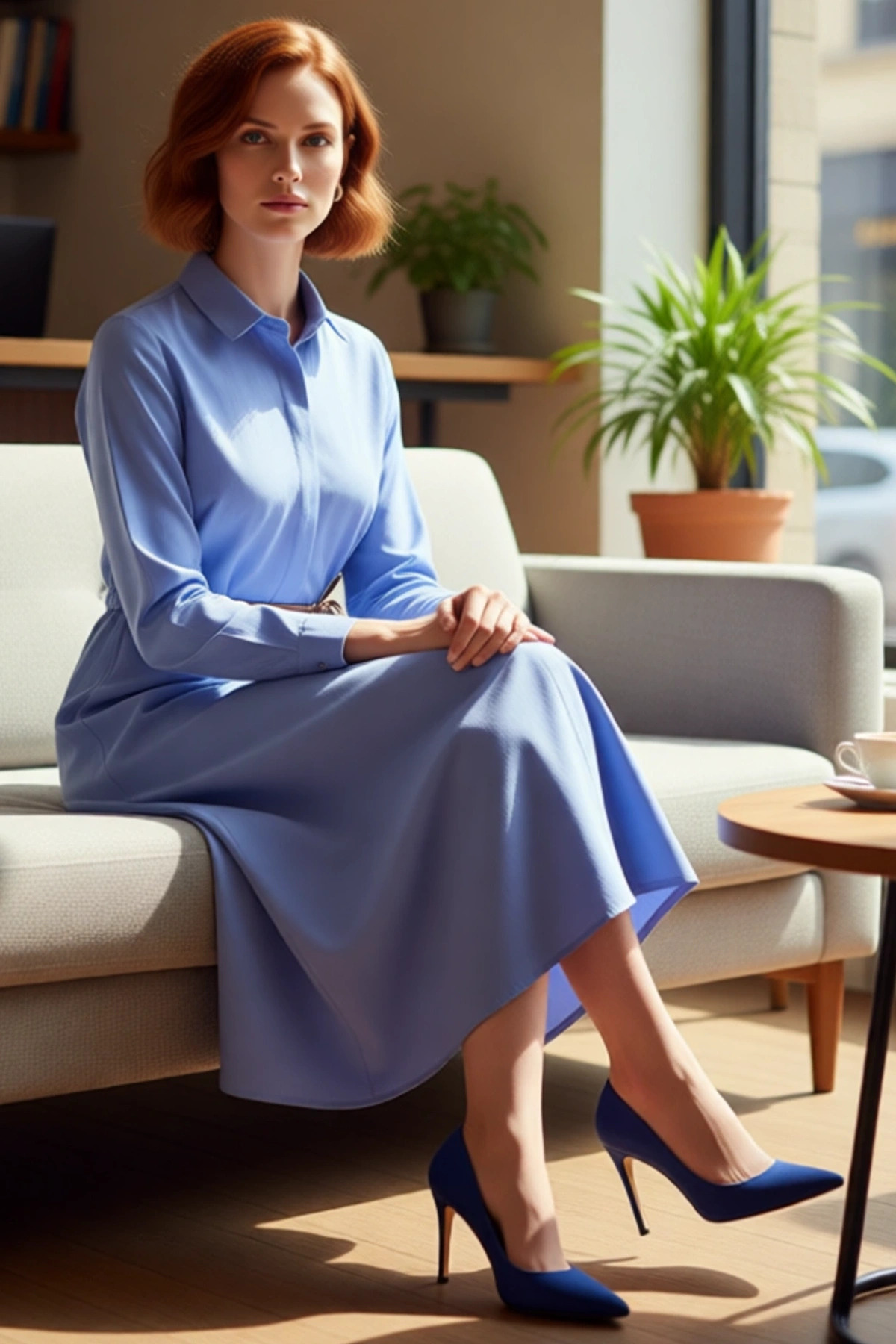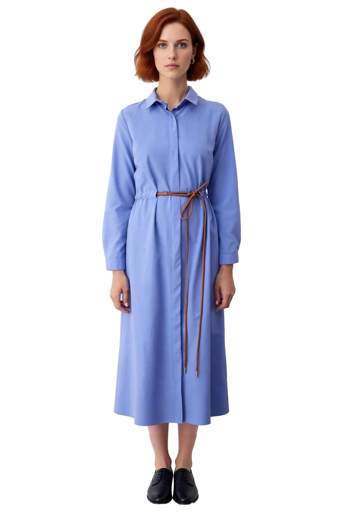 Ürün Özellikleri: A-line kalıp, dokuma materyal, düz desen, gömlek yaka, standart kol, terrycotton kumaş, mavi renk, kemerli tasarım.