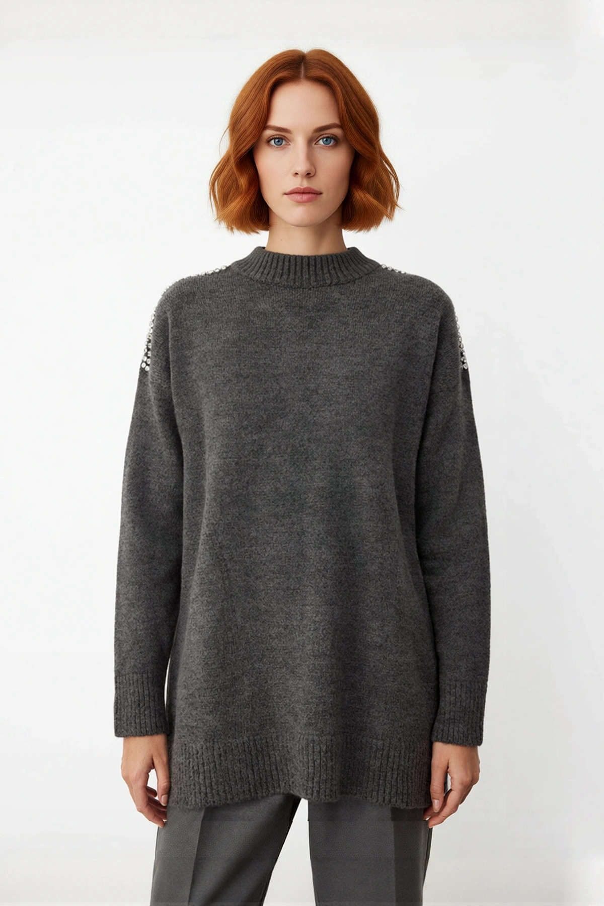 Bu zarif kadın triko kazak, tesettür giyim koleksiyonunun şıklığını omuzlarındaki taş detaylarıyla birleştiriyor. Regular kalıbı, rahat bir kullanım sunarken vücuda modern bir duruş kazandırır. %75 Akrilik, %22 Polyester ve %3 Elastan materyal bileşeni sayesinde soğuk kış günlerinde üstün sıcaklık ve yumuşaklık hissi sağlar. Gri rengi, her türlü kombinle uyum sağlayarak gardırobunuzun joker parçalarından biri olmaya adaydır. Düz tasarımı, omuzlardaki parlak taş işlemelerle hareketlenerek feminen ve sofistike bir stil yaratır.
