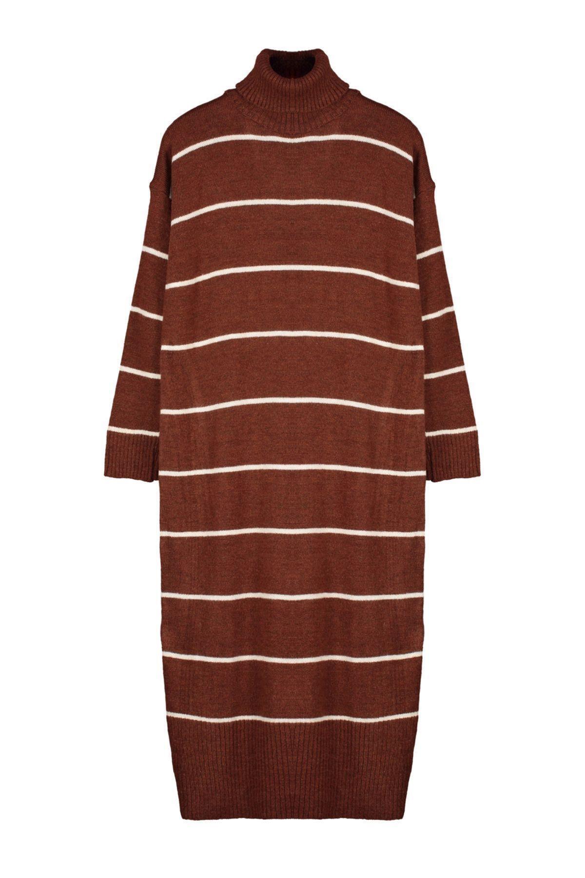 Kadın Triko Balıkçı Yaka Midi Boy Çizgili Düşük Kol Rahat Kalıp Elbise, günlük şıklığınızı kış ve sonbahar aylarında tamamlayacak göz alıcı bir parçadır. Rahat kalıbı sayesinde vücudunuzda özgür bir hareket alanı yaratırken, 75% akrilik ve 25% polyester materyal bileşimi yumuşacık bir his ve üstün sıcaklık sunar. Antrasit zemin üzerine zarifçe yerleştirilmiş çizgili deseni, elbiseye modern ve sofistike bir hava katarken, gri rengiyle her türlü aksesuarla uyum içinde. Bu elbise, soğuk havalarda bile tarzından ödün vermek istemeyen kadınlar için ideal bir seçenektir.