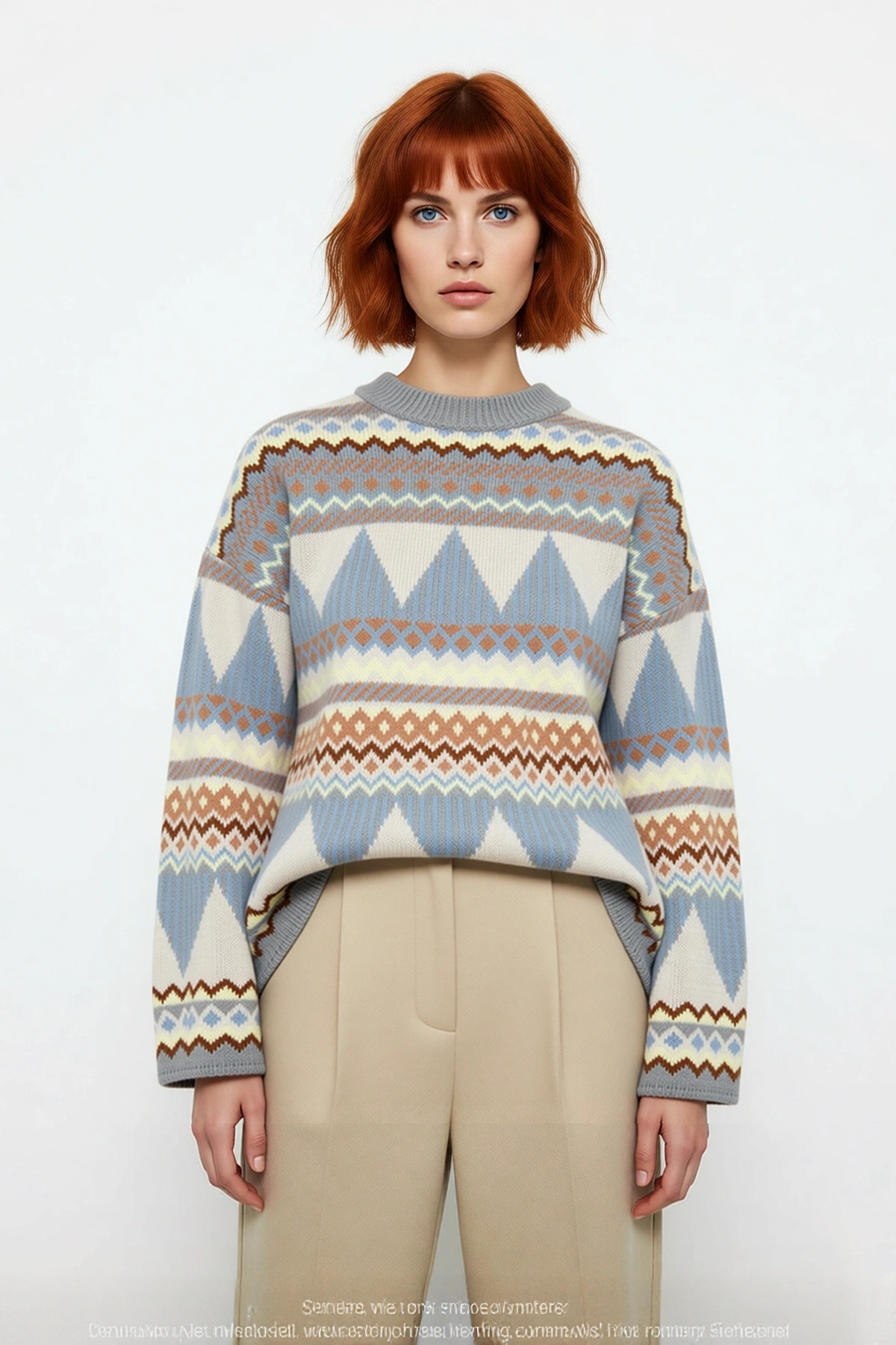 Ürün Özellikleri: Oversize kalıp, akrilik materyal, etnik desen, bisiklet yaka, düşük kol, triko kumaş, gri renk, baskısız tasarım.