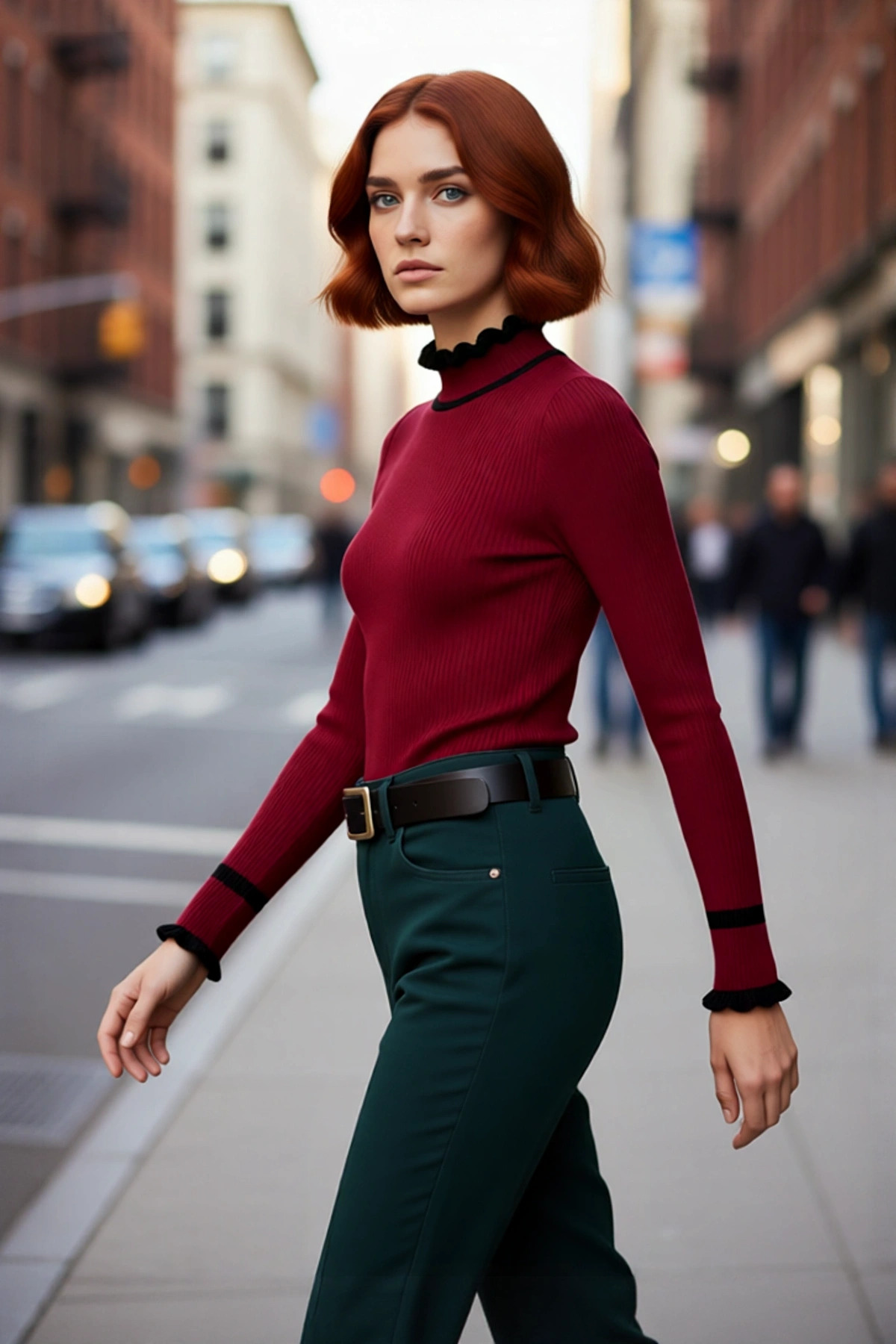Bu modern kadın kazak, fitted kalıbı sayesinde vücudunuzu kusursuzca sarar ve zarif bir görünüm sunar. %100 akrilik materyalden üretilen bu parça, kış aylarında sıcak tutarken aynı zamanda cildinize narin bir dokunuş hissi verir. Mavi rengi, yaka ve kol manşetlerindeki beyaz fırfırlı detaylarla oluşturulan renk bloklu desenle birleşerek kıyafetinize dinamik ve çağdaş bir hava katar. Fitilli dokuma tipi, kazaka hem estetik bir derinlik hem de dokunsal bir zenginlik kazandırır, basic silueti ise günlük kombinlerinize kolayca adapte olur. Cepsiz tasarımı minimalist bir şıklık sunar.