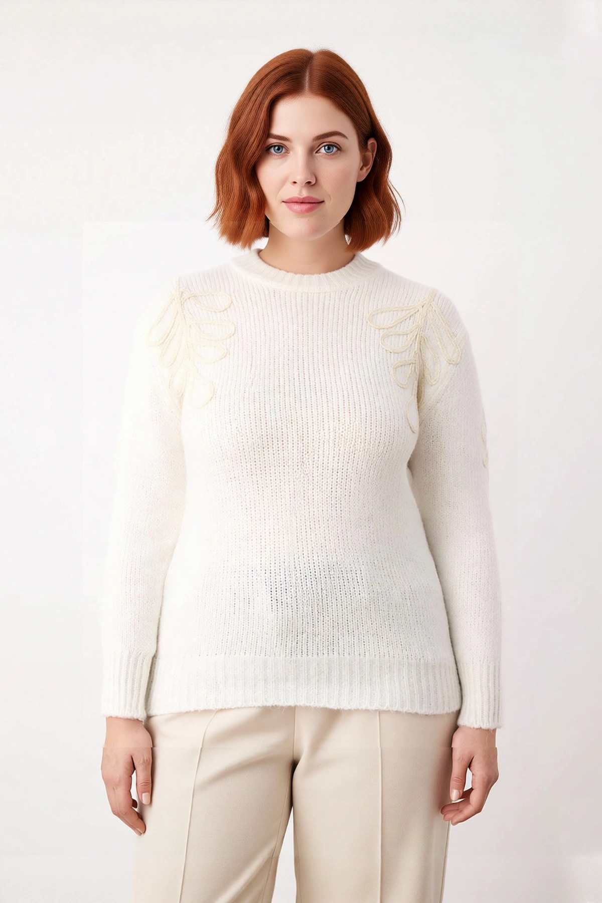 Kadın Triko Kazak Ekru Rengi Düşük Kollu Bisiklet Yaka Çiçek Nakışlı Kış Şıklığı Sunar Kaliteli