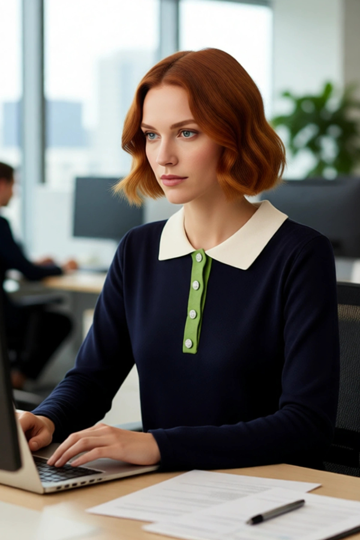 Kadın Triko Kazak Lacivert Renk Bloklu Polo Yaka Taş Düğmeli Soğuk Havalar İçin İdeal Seçim