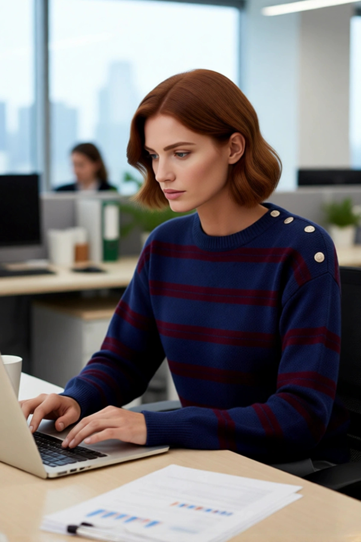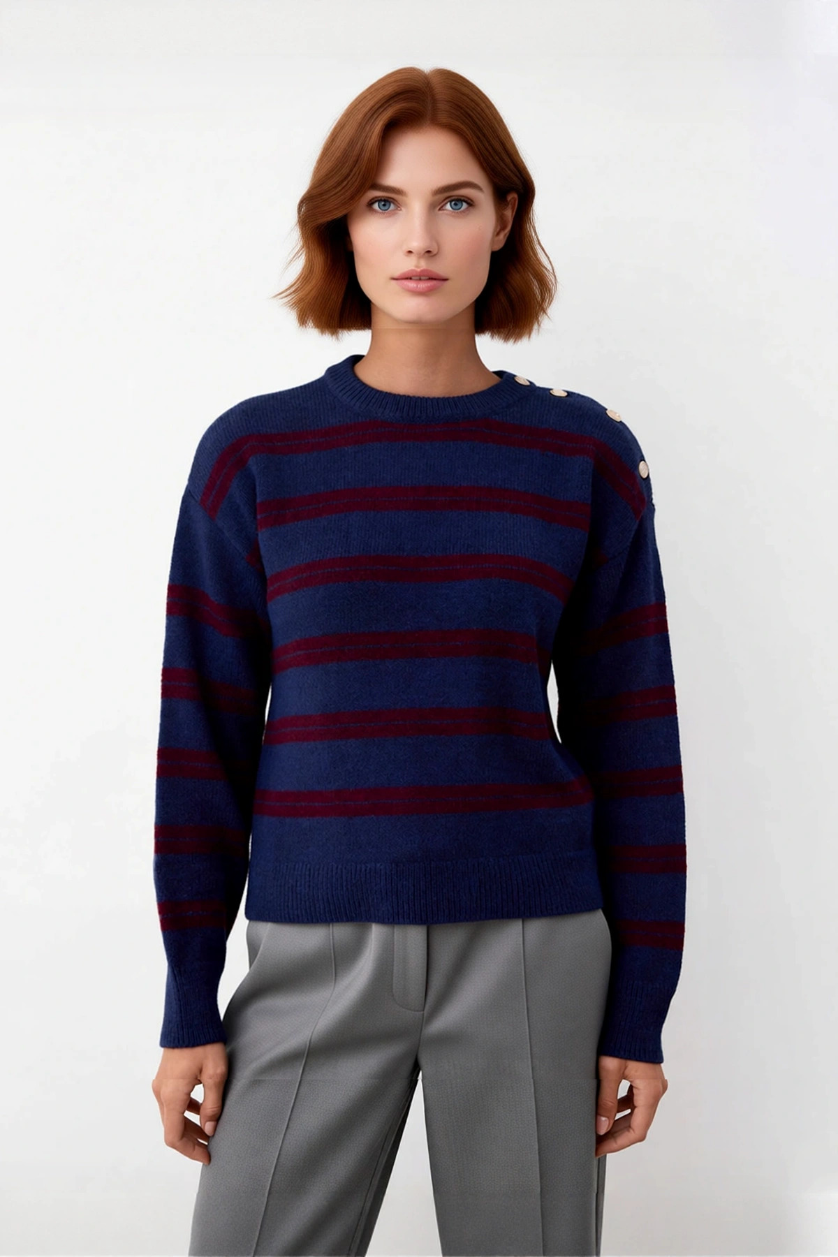 Konforlu ve şık giyimin adresi olan bu Kadın Triko Kazak, regular kalıbı ile gün boyu rahat bir kullanım vadediyor. Yüksek kaliteli materyal bileşimi (82% Akrilik, 9% Polyester, 9% Poliamid) sayesinde soğuk kış günlerinde sizi sıcacık tutarken, yumuşacık dokusuyla cildinize narin bir temas sunar. Lacivert ve bordo renklerin harmonize olduğu çizgili deseni, kazağa modern ve enerjik bir hava katarken, omuzlardaki zarif düğme detayları şıklığına ayrıcalık katar. Bu kazak, soğuk havalarda stil sahibi olmak isteyen kadınlar için tasarlandı.