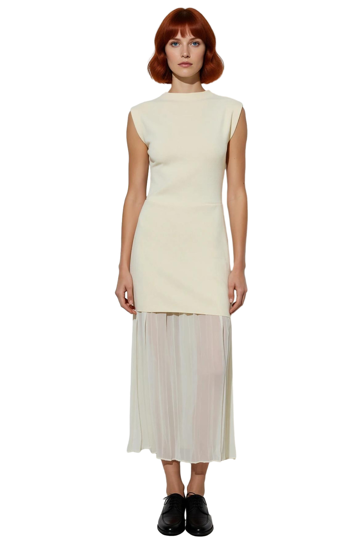 Ürün Özellikleri: Skater kalıp, %100 polyester materyal, düz desen, bisiklet yaka, kolsuz, triko kumaş, ekru renk.
